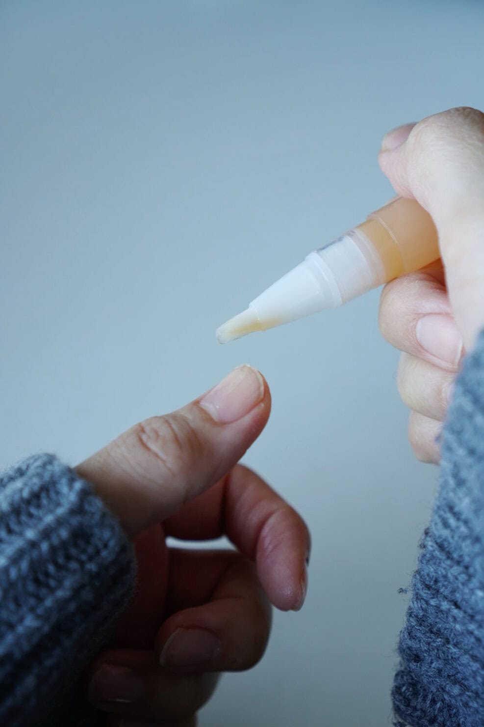 爪みがきで磨くと、爪の油分が取れやすくなるので、仕上げには保湿が重要です。甘皮部分にも塗って、軽くマッサージしています。