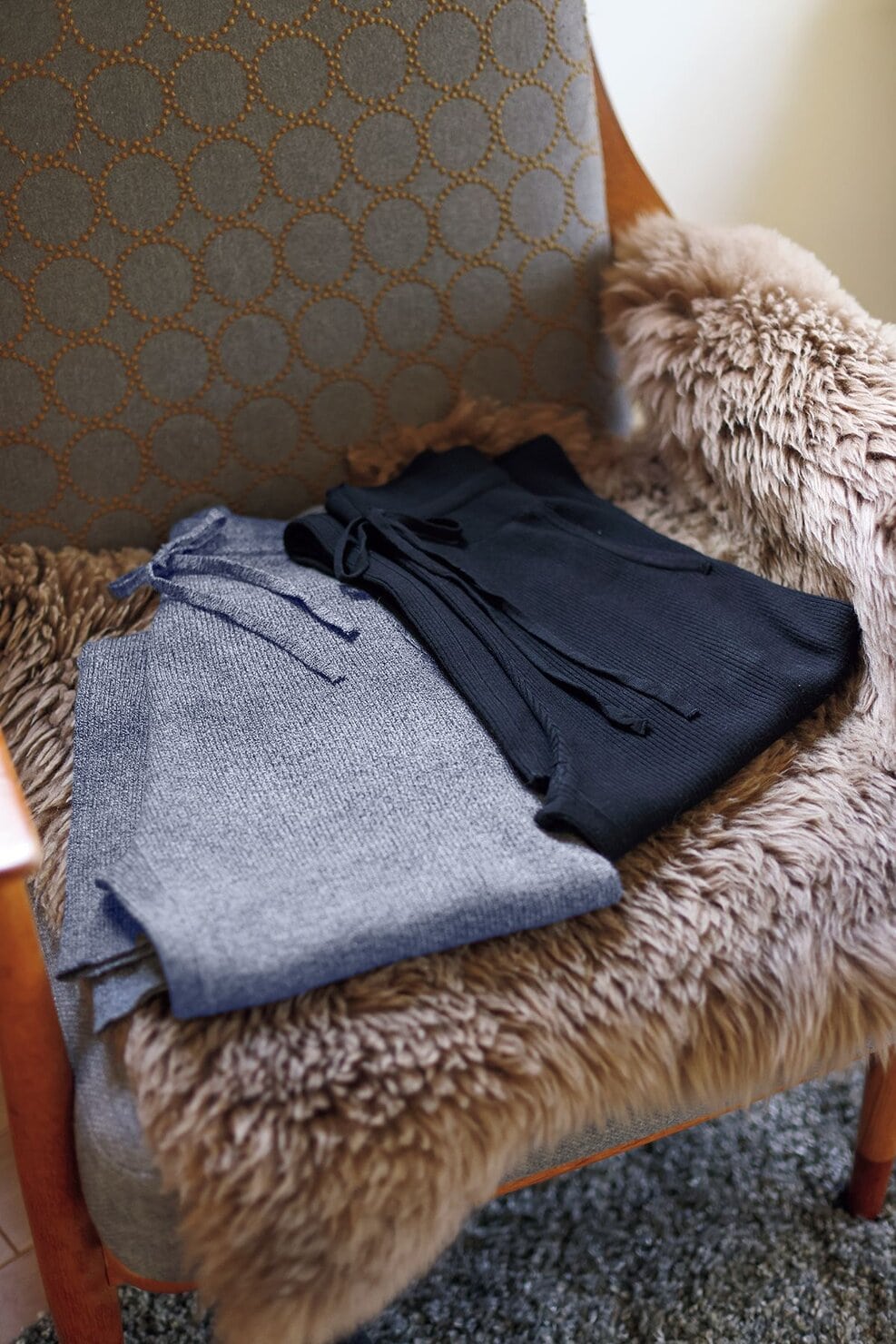 「いつも着ている部屋着はワンピースが定番ですが、最近、肌触りがよく暖かいニットパンツを下にはいています」