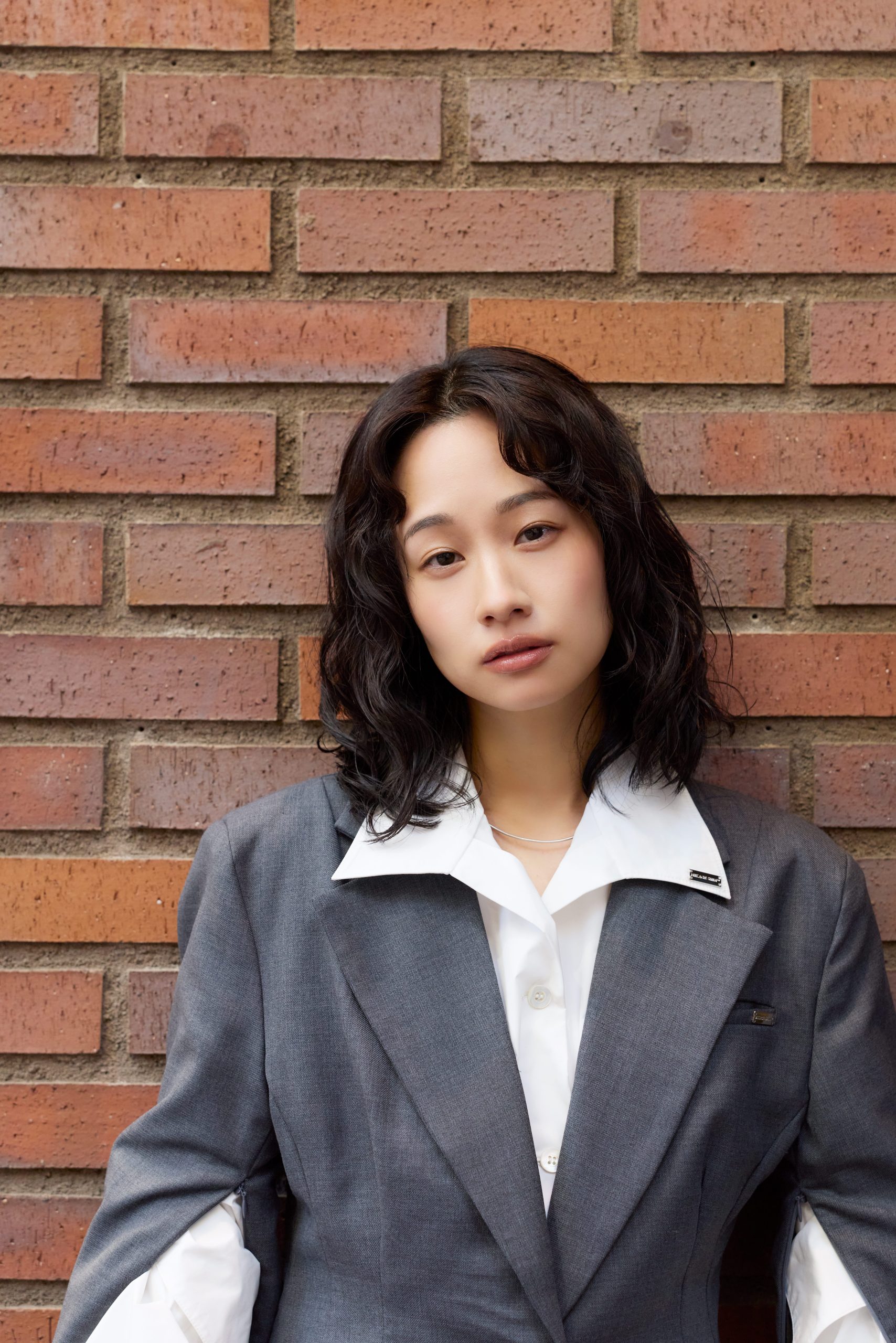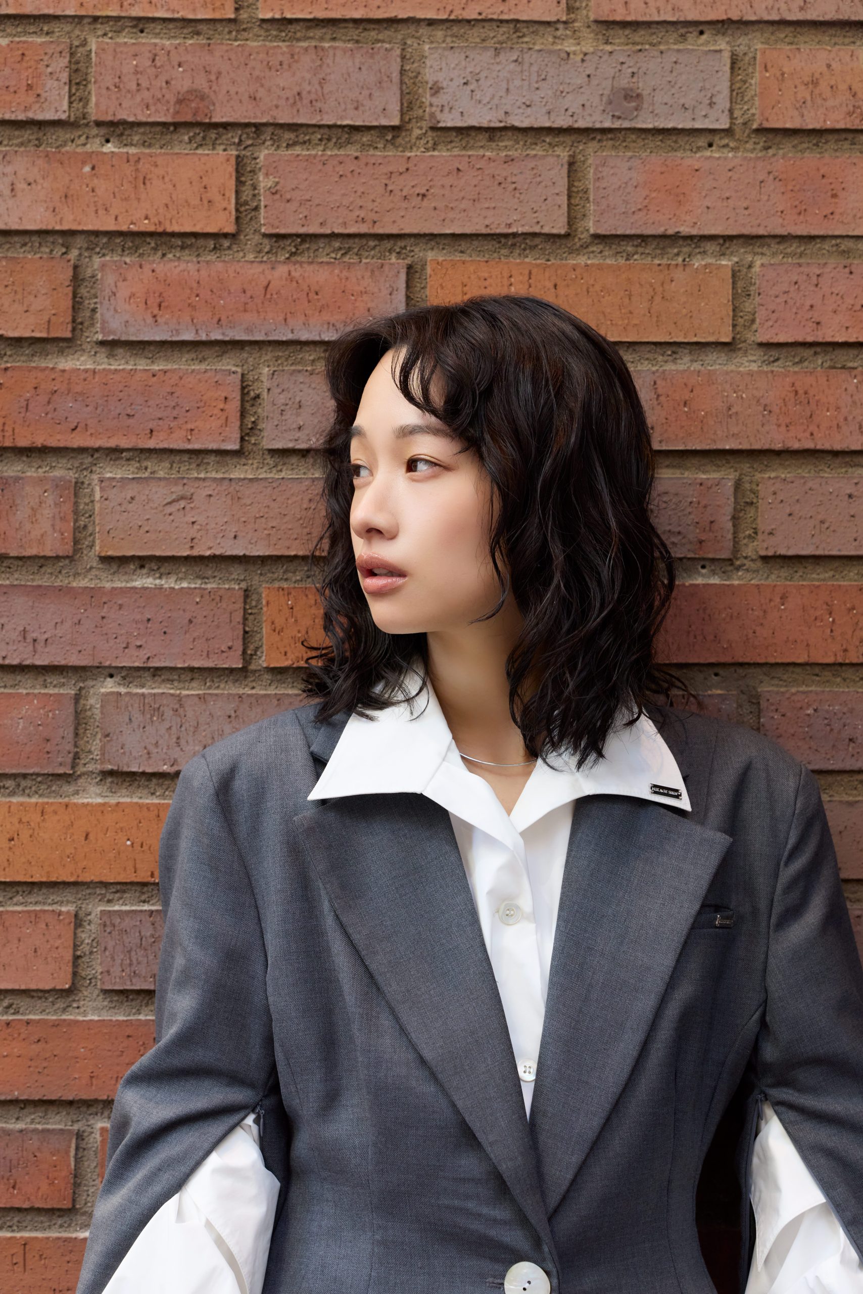 ジャケット¥66,000、シャツ¥66,000、パンツ¥44,000/すべてMIKAGE SHIN(MIKAGE SHIN, INC.)、チョーカー¥36,300/e.m.(e.m. 青山店)、リング¥14,300/Soierie(Soierie)