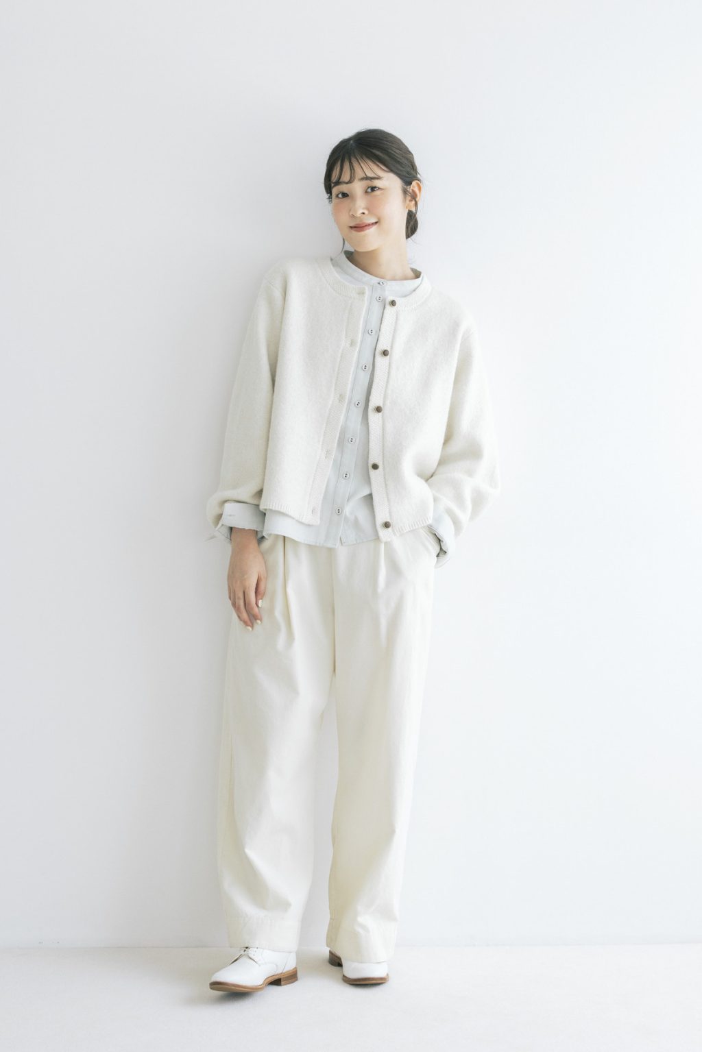 白のニットジャケットとパンツに合わせた、ミントグリーンのシャツがポイントのホワイトコーデ。フリルの襟を外して、襟もとはすっきり。シャツは後ろがラウンドしたデザインになっていて、ニットと合わせたときのバランスも絶妙です。