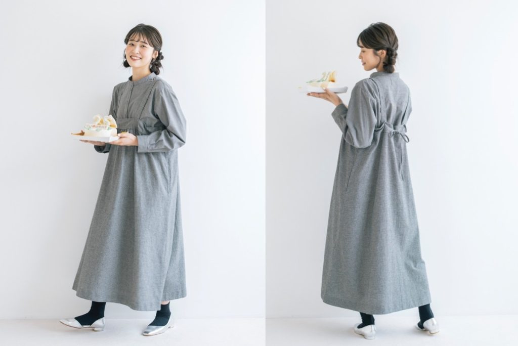 「大人でも着やすいよう、かわいすぎない細めの肩ひもをセレクト。後ろのひもで身幅を調節でき、ニットやスウェットなど冬の重ね着も楽しめて、重宝するアイテムです」