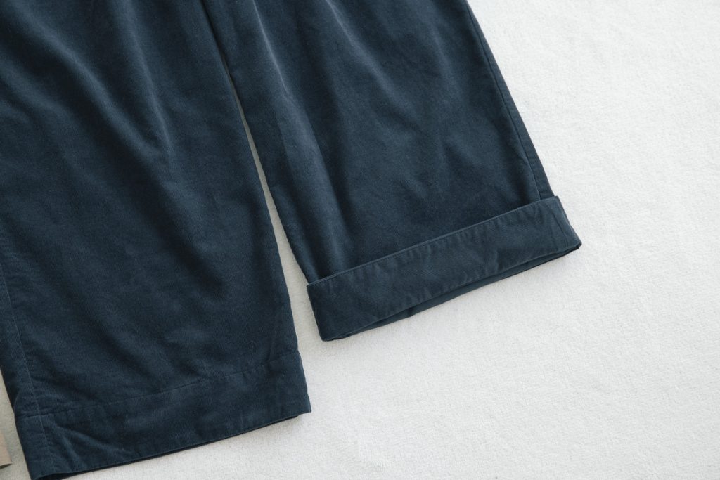 細畝のコーデュロイを使った、ほどよい太さのフルレングスパンツ。薄手で軽く、長い時期活躍しそう。