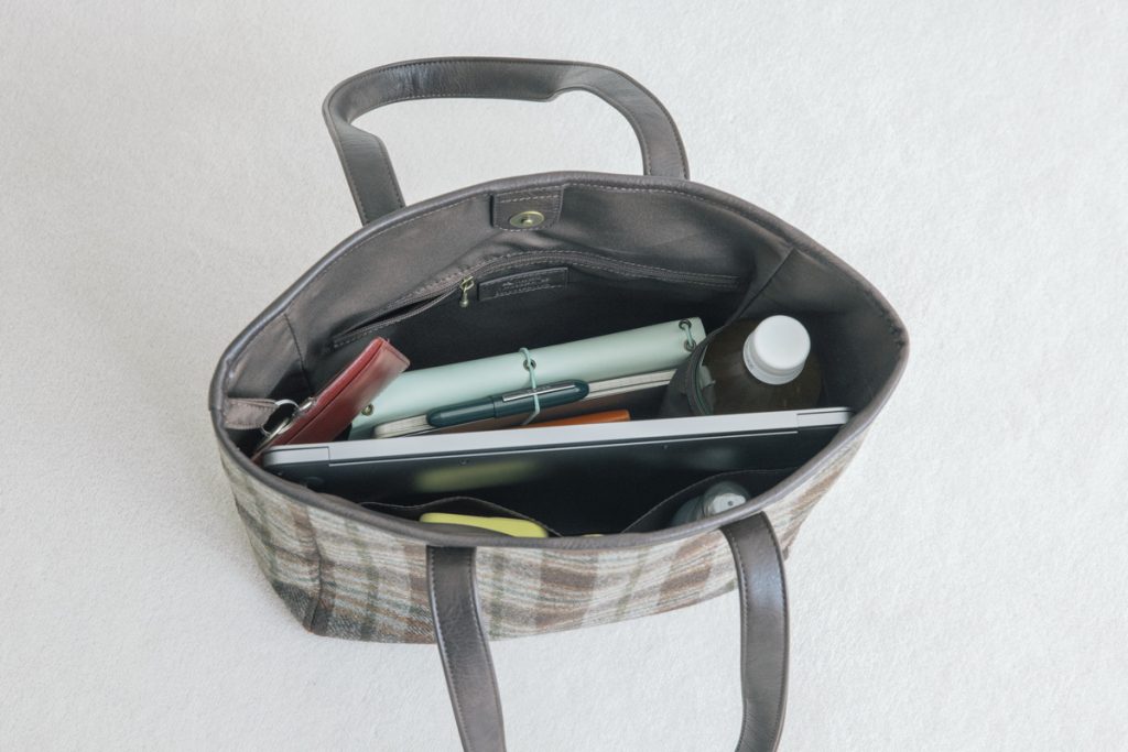 ゆべしさんとリンネルが選んだこだわりのチェック柄と、オリジナルのドットを刺しゅうしたツイードを使用。ファスナー付きのポケットや水筒ホルダー、大切な鍵などをつけられるループなど機能性が高く、収納力もあるので、毎日の仕事にも活躍します。