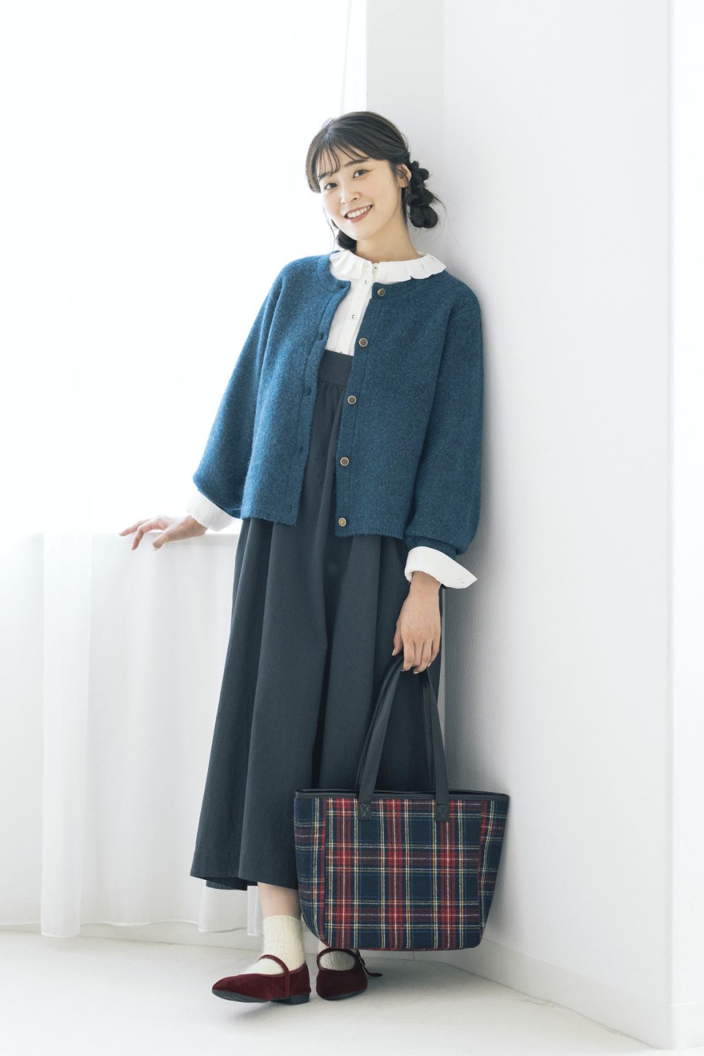 ゆべしさんがこの冬気になるという、深いブルーのニットジャケットが主役の、きちんと感のある着こなし。ブリティッシュスタイルをイメージして、バッグにもタータンチェックを取り入れて。