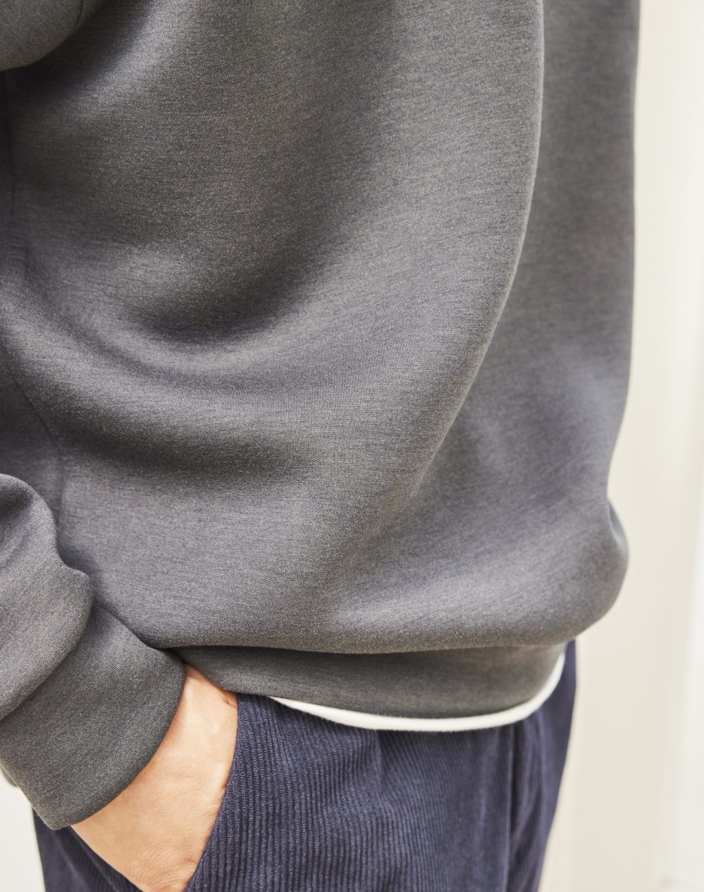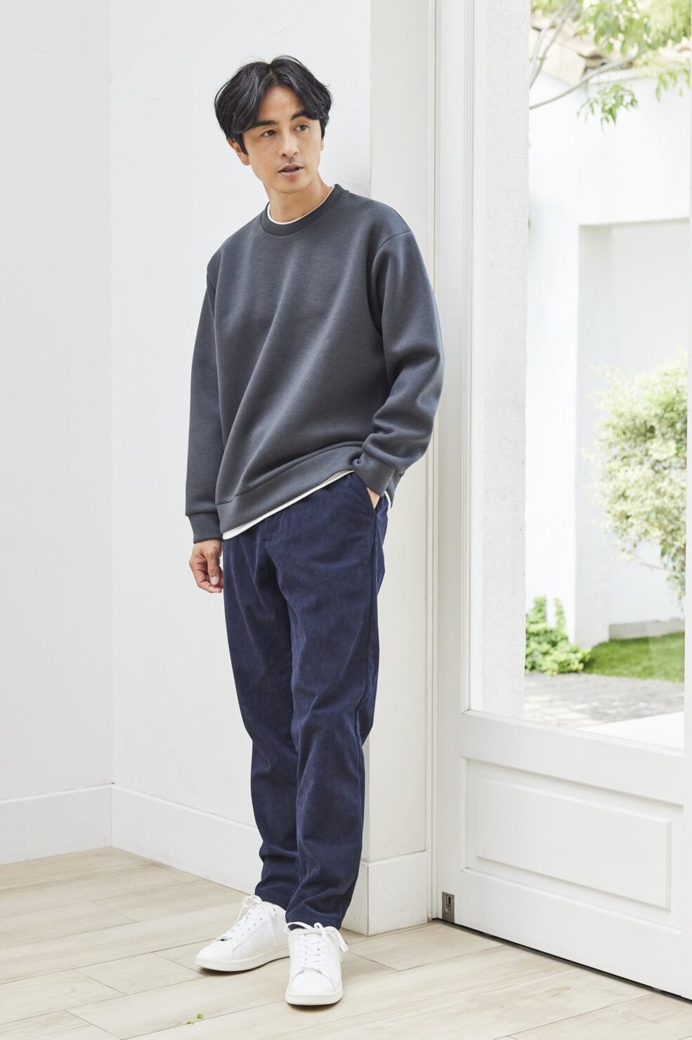 プニュフィット独特の滑らかな表面感で、さっと着るだけでこなれ感が漂う大人のプルオーバー。首もとと裾からチラりと覗く白Tディテールも抜け感に一役。