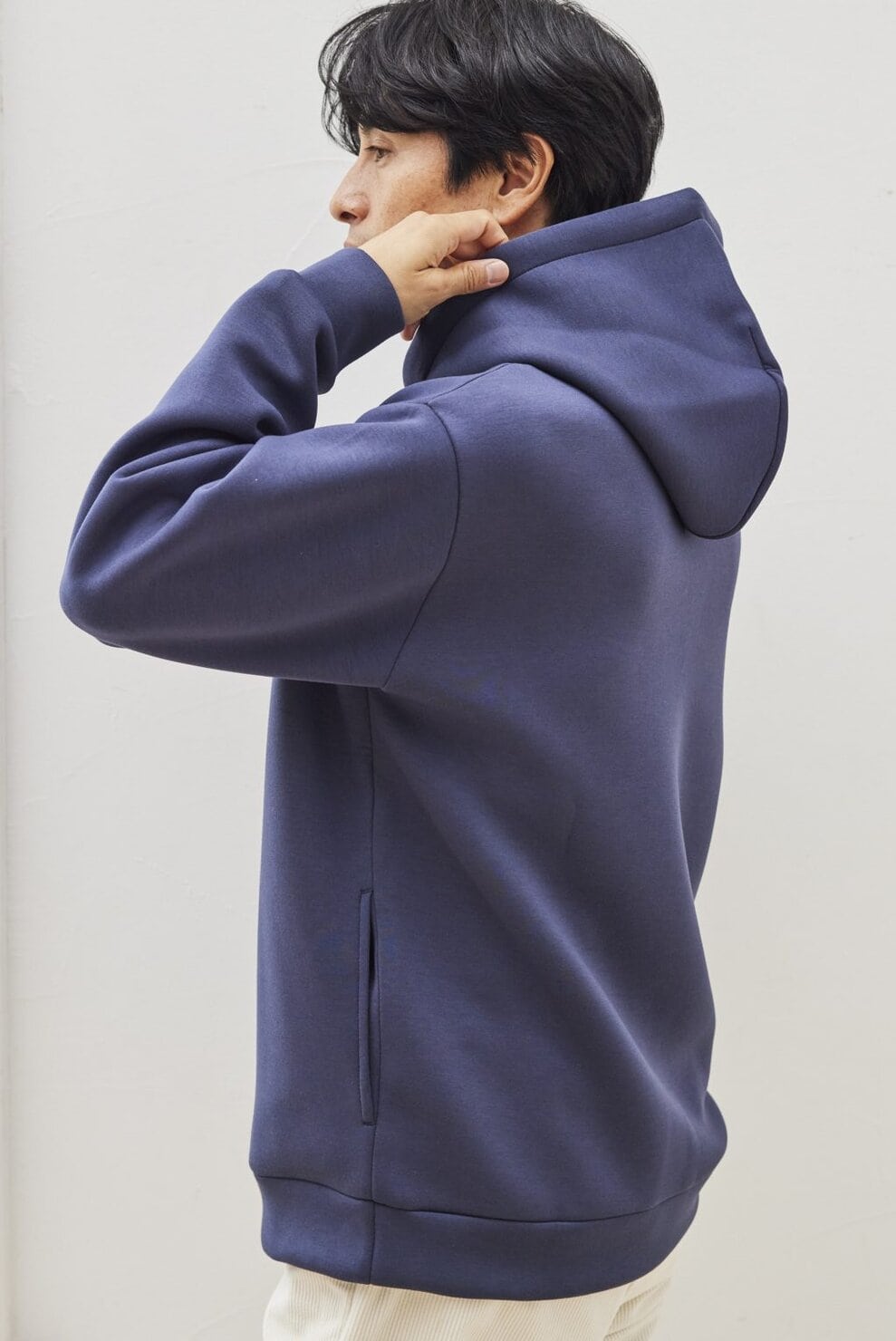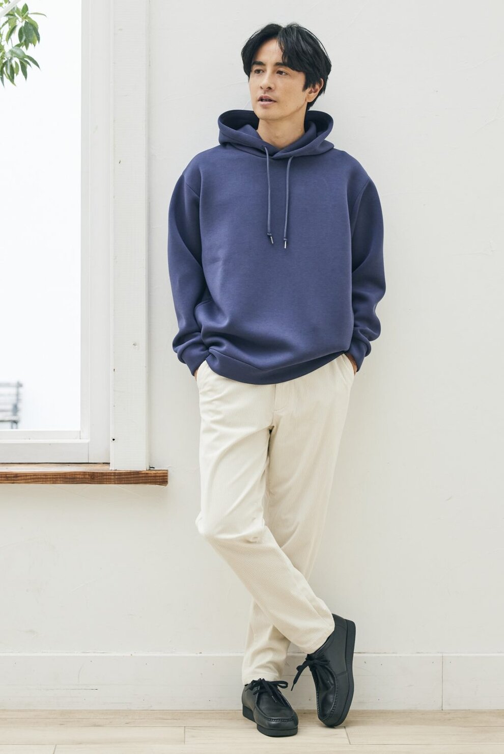 滑らかで艶がかった上品ネイビーのパーカを主役に。ざっくりオーバーサイズで着こなせるから、パートナーとシェアするのもよさそう。