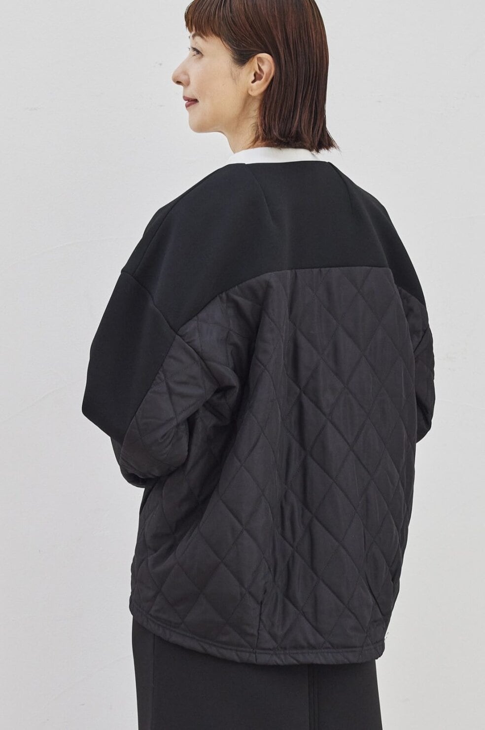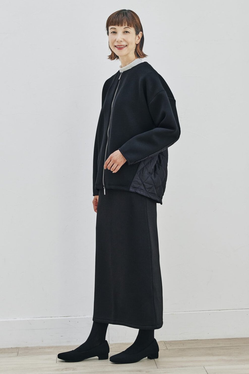 バックキルトデザインがモダン見えするプニュフィットの新作。ジャケットとスカートのセットアップもお洒落。ブラックのワントーンで凜とした大人の佇まいに。