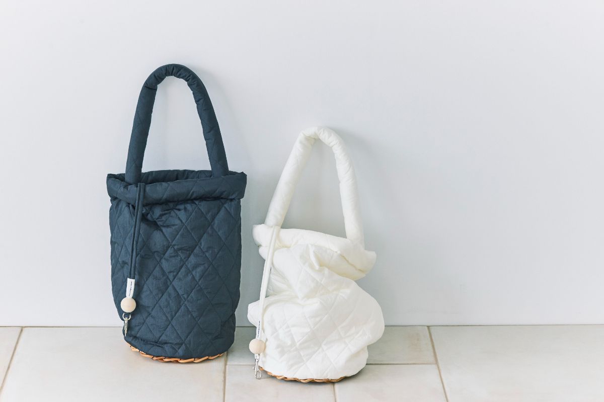 キルティングにかごの底をあしらったバケツ形のバッグは、白と黒の2色展開。