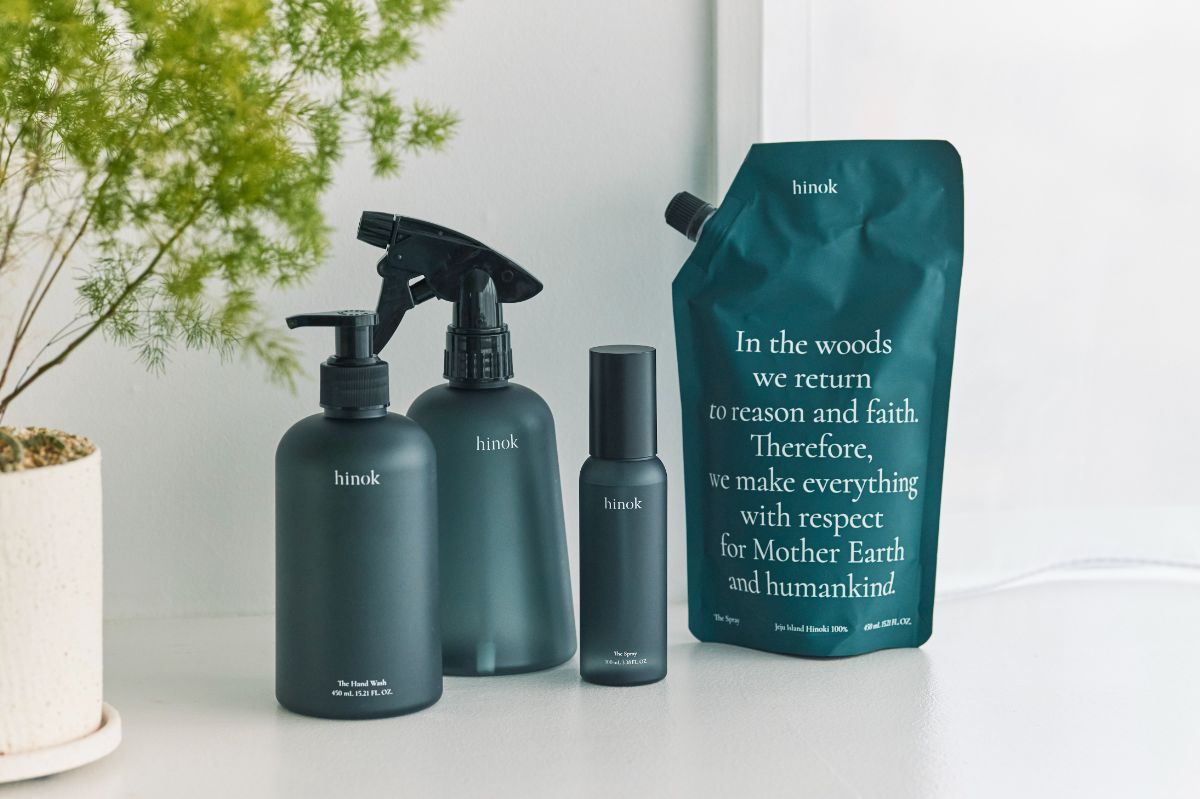 左から、ハンドウォッシュ¥6,380、ルームスプレーのボトルとリフィルセット¥5,170、スプレートゥーゴー¥2,420/すべてヒノック
