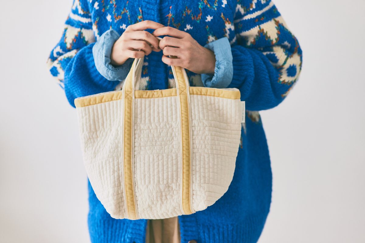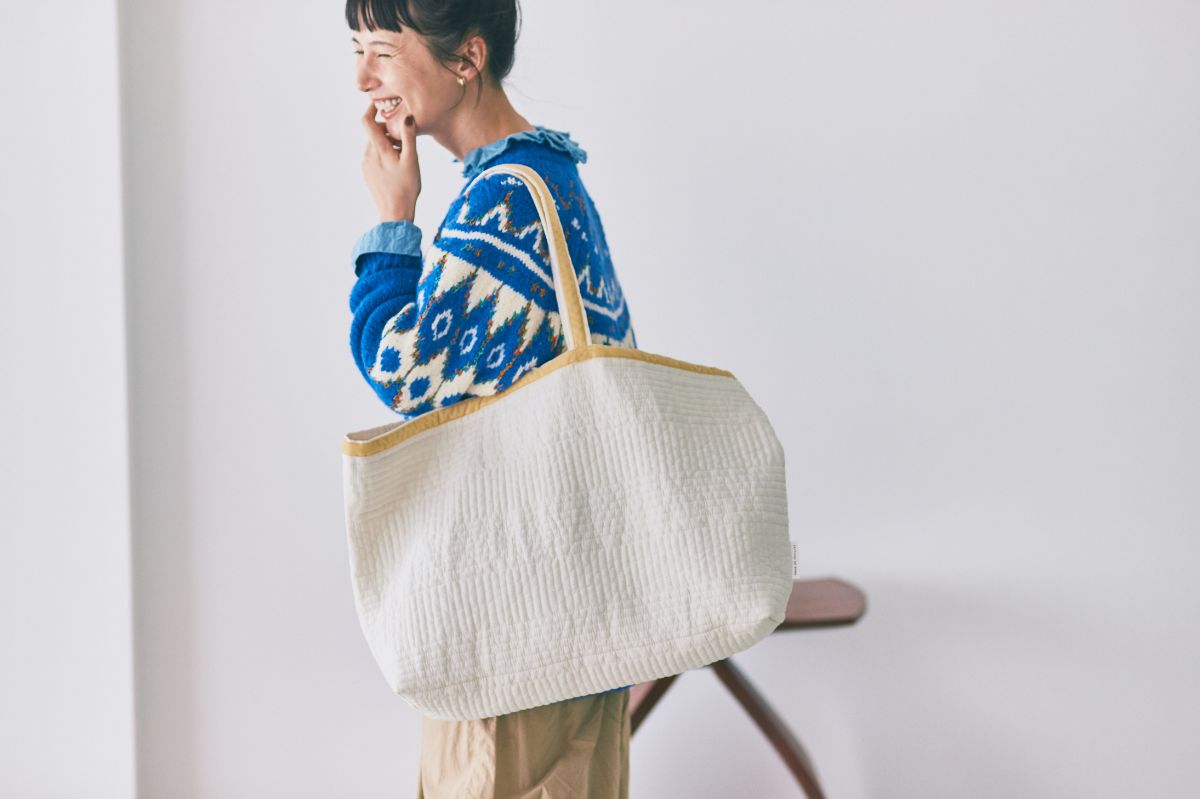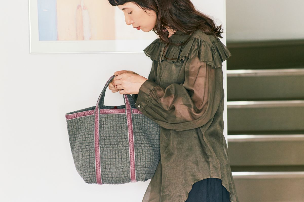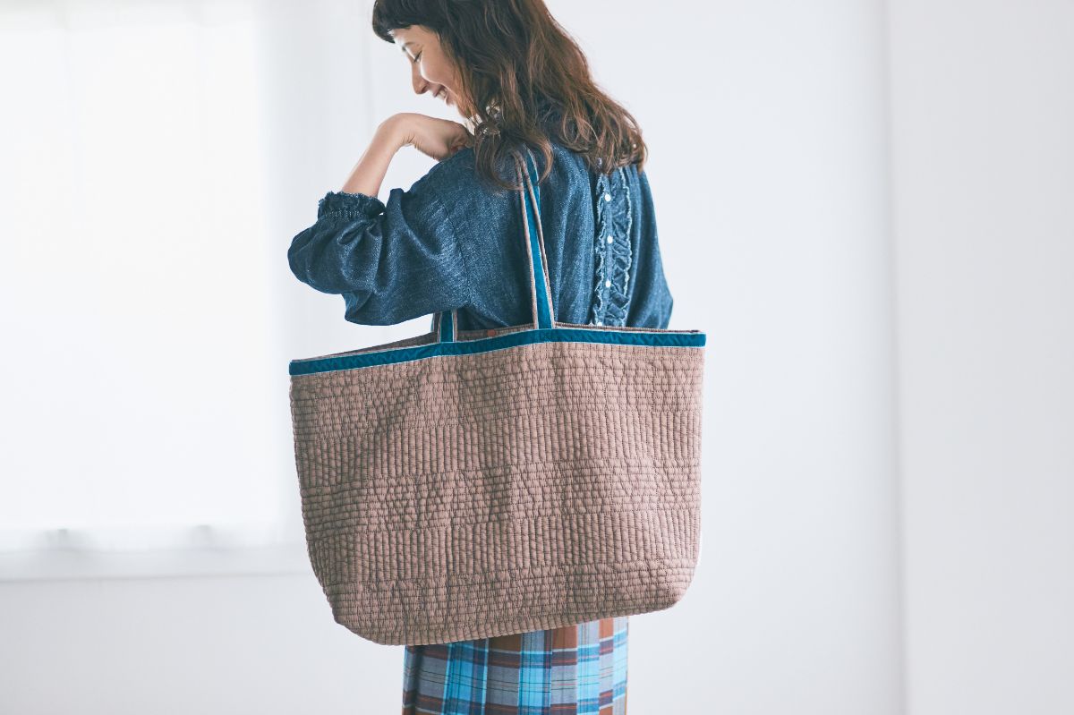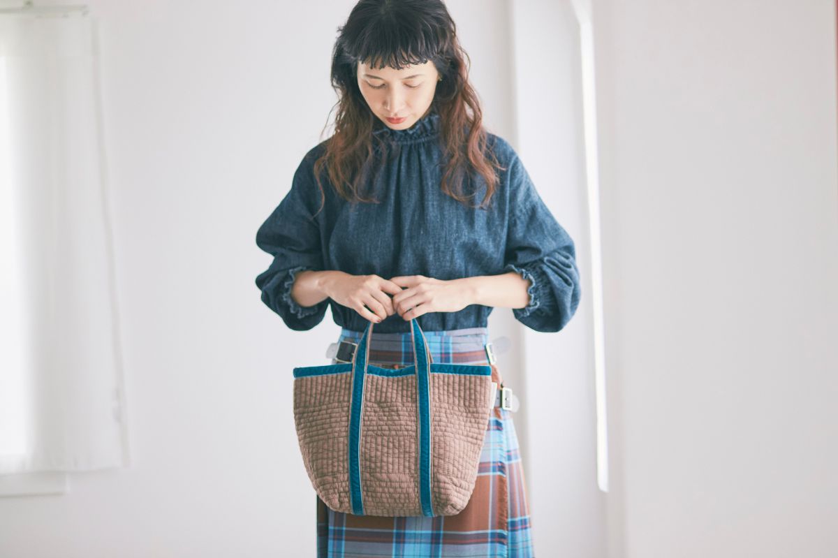 「冬に持つかごバッグってすごくかわいいと思っているんです。今回は、ぬくもりのあるキルティングと組み合わせて、ふっくらやさしい雰囲気に。見た目以上にたくさん入って自立するので、出し入れもしやすいです」