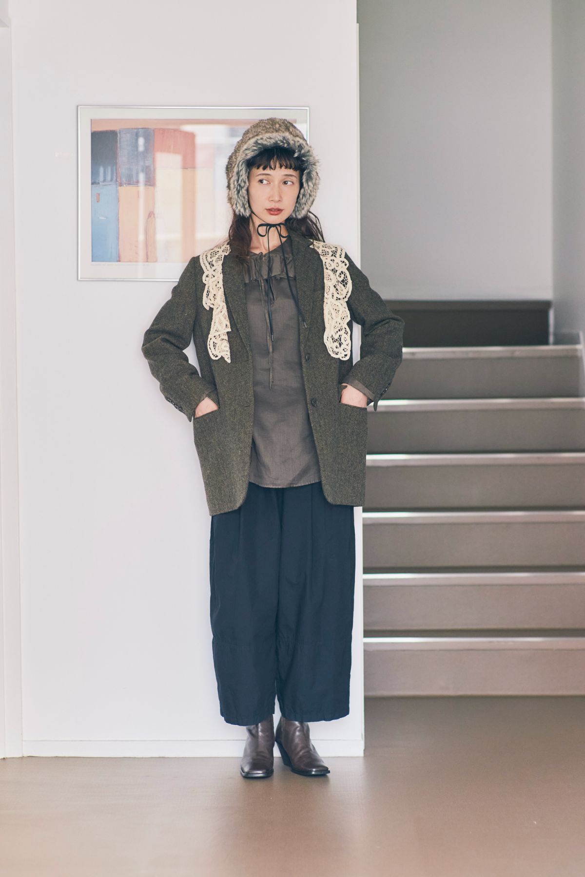 ジャケット¥68,200、ブラウス¥24,200/ともにエリテ、パンツ¥26,400/ヴェリテクール、フード¥18,700/ミア ハットアンドアクセサリー、その他/スタイリスト私物