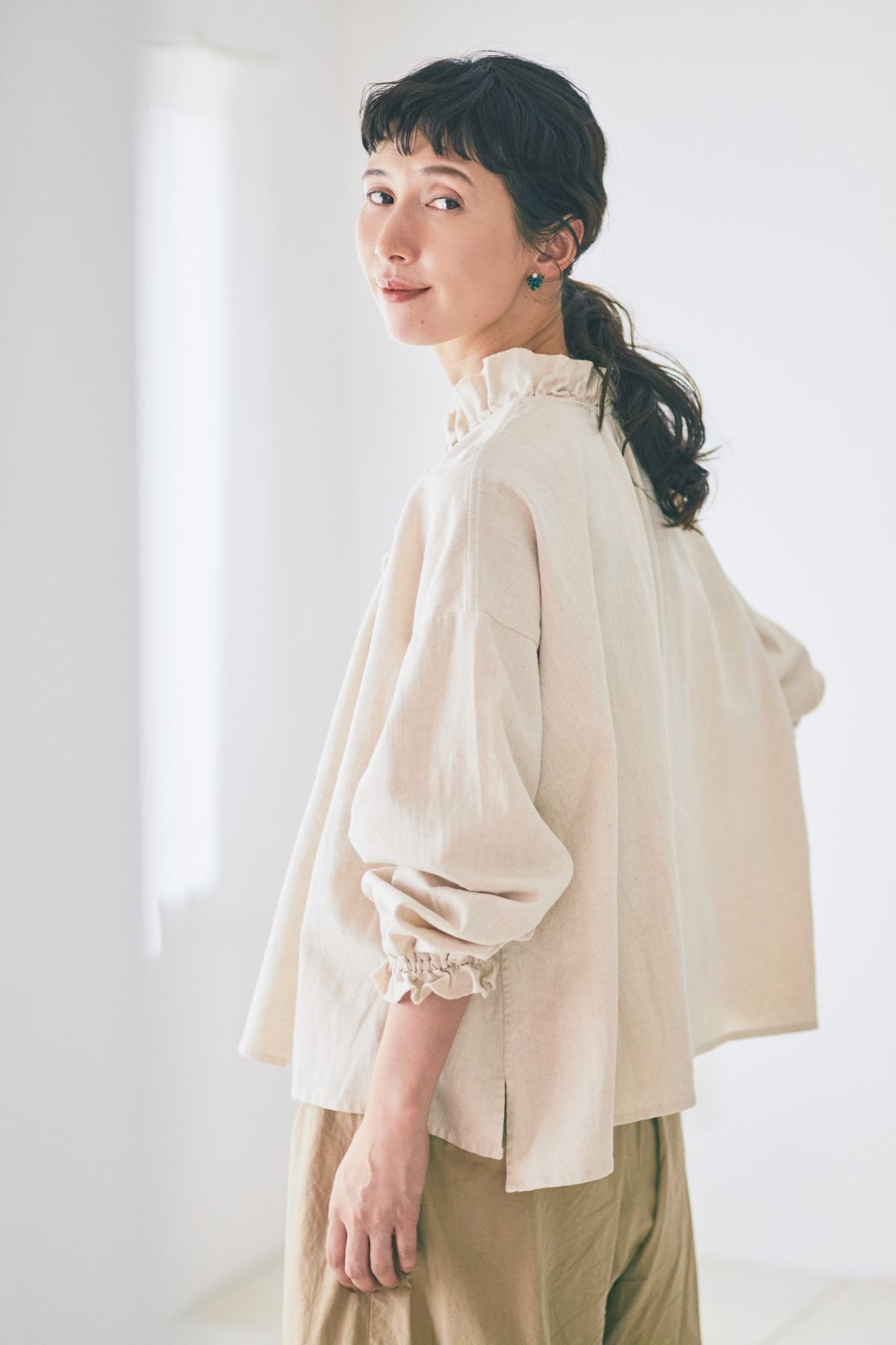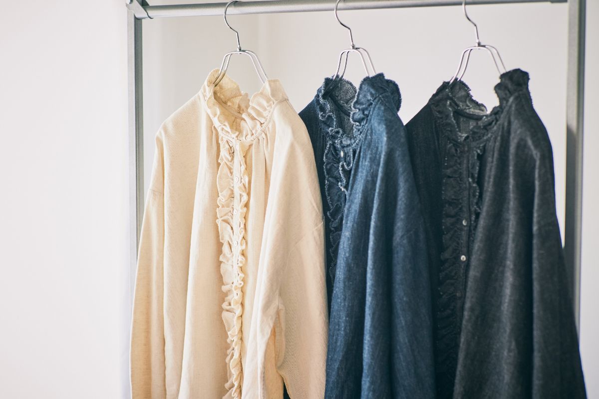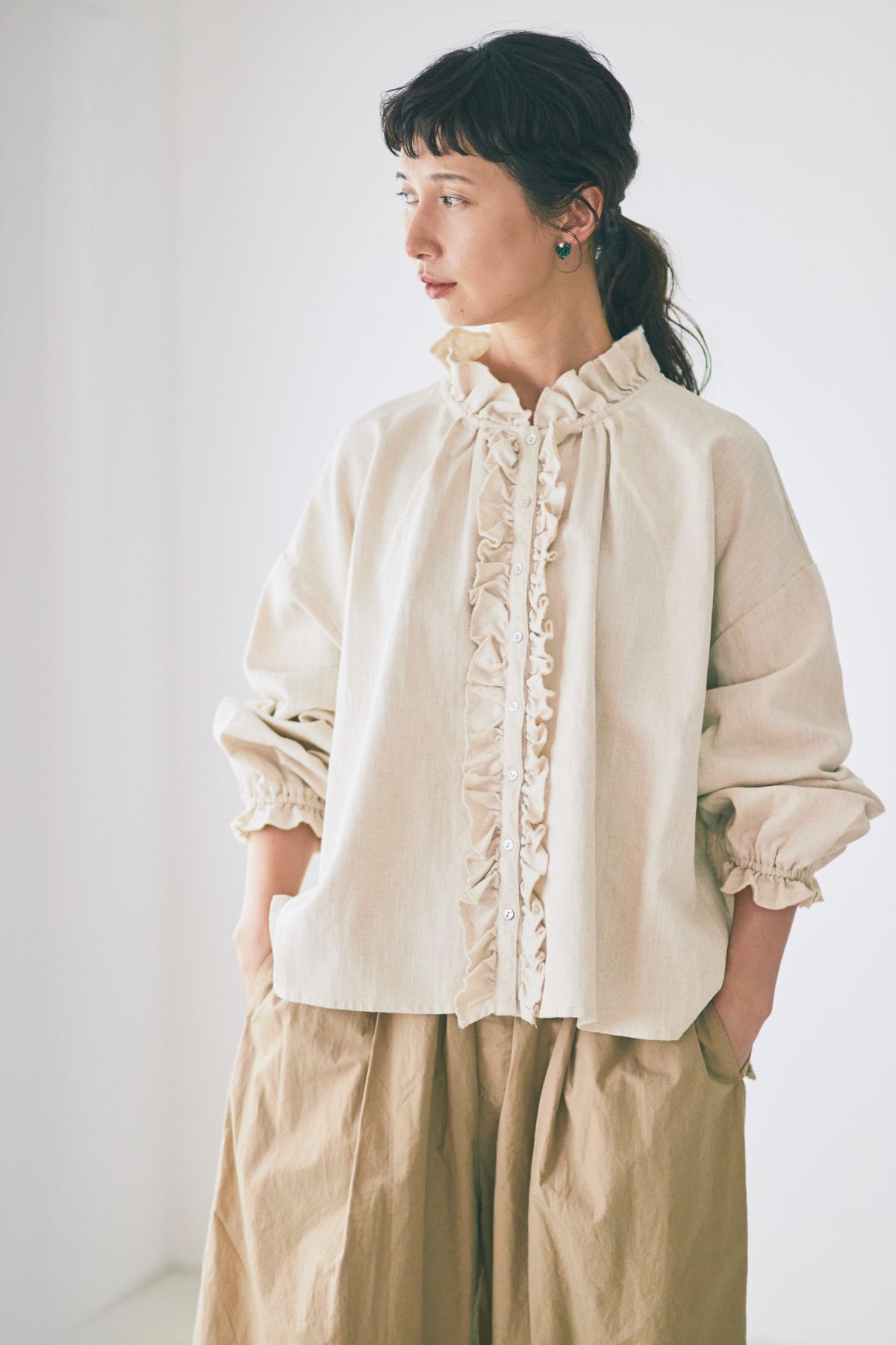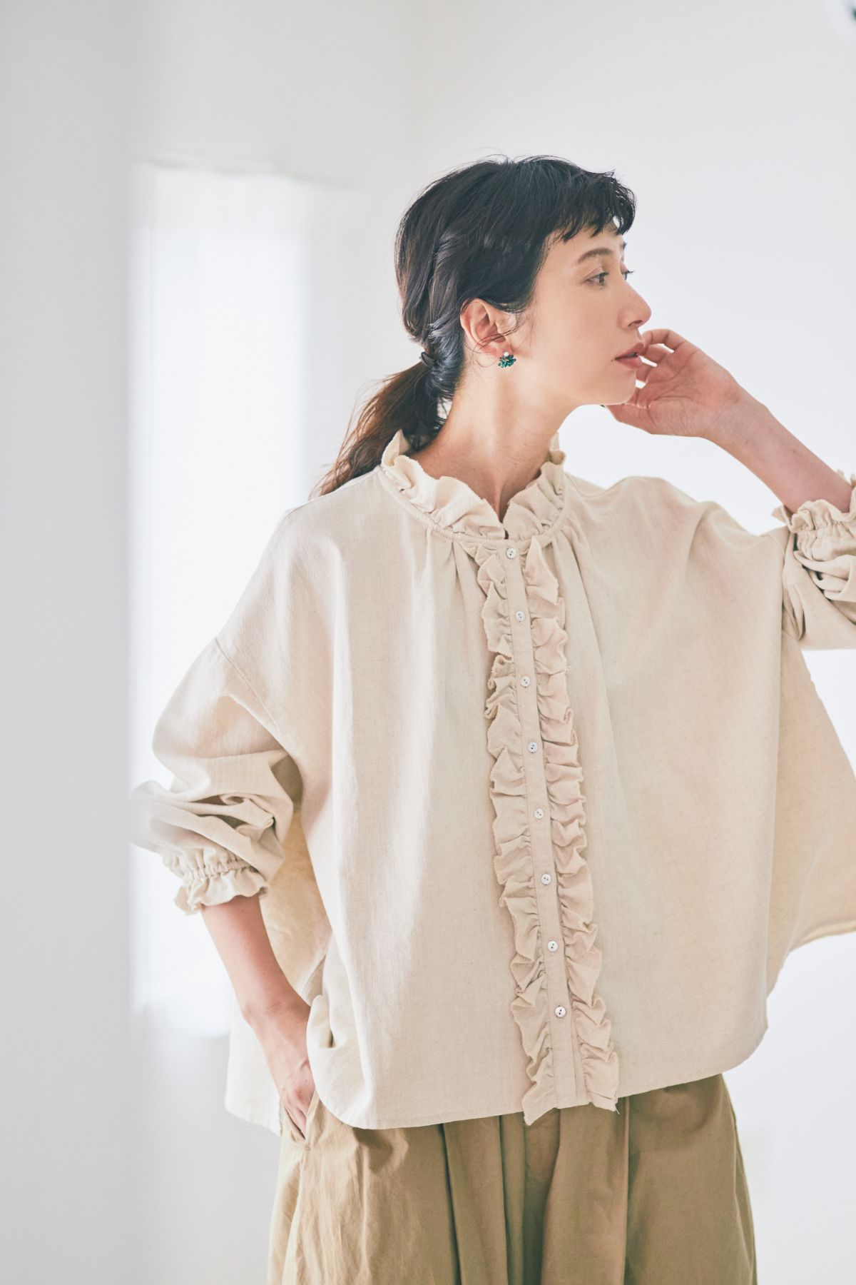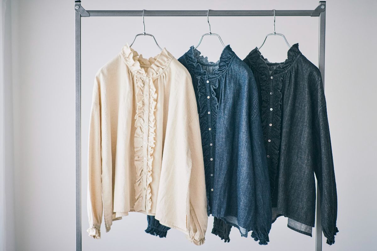 襟もとやフロントのボリューミーなフリルが素敵なブラウスは、前後どちらを前にしても着られる2way。ナチュラルと、デニム素材のインディゴ、ブラックの3色を用意。