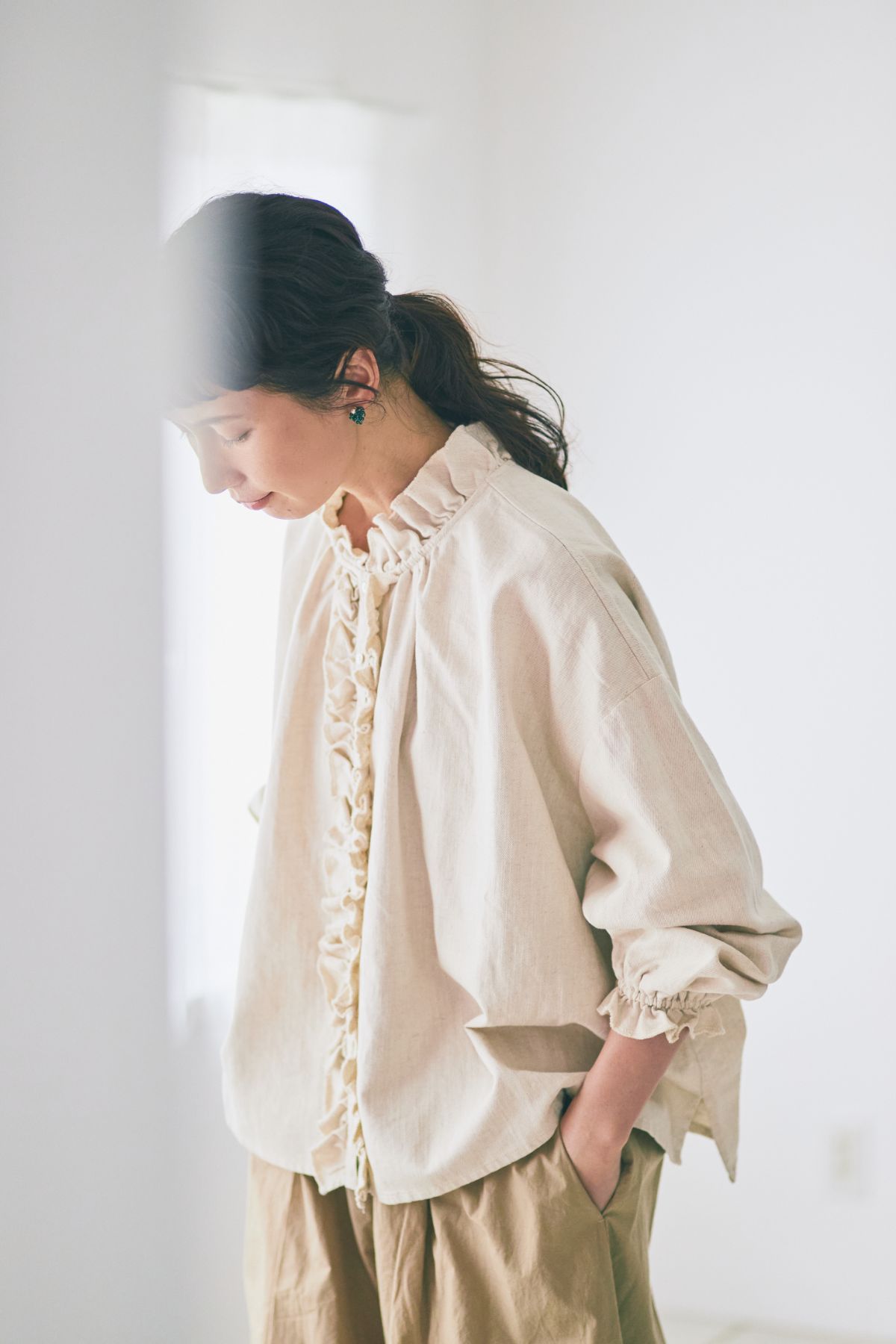 「いろんな着方ができて、季節を越えて楽しめるものを作りたくて。ほどよい厚みのある生地なので、はおってもアウターやニットを重ねてもかわいいと思います」