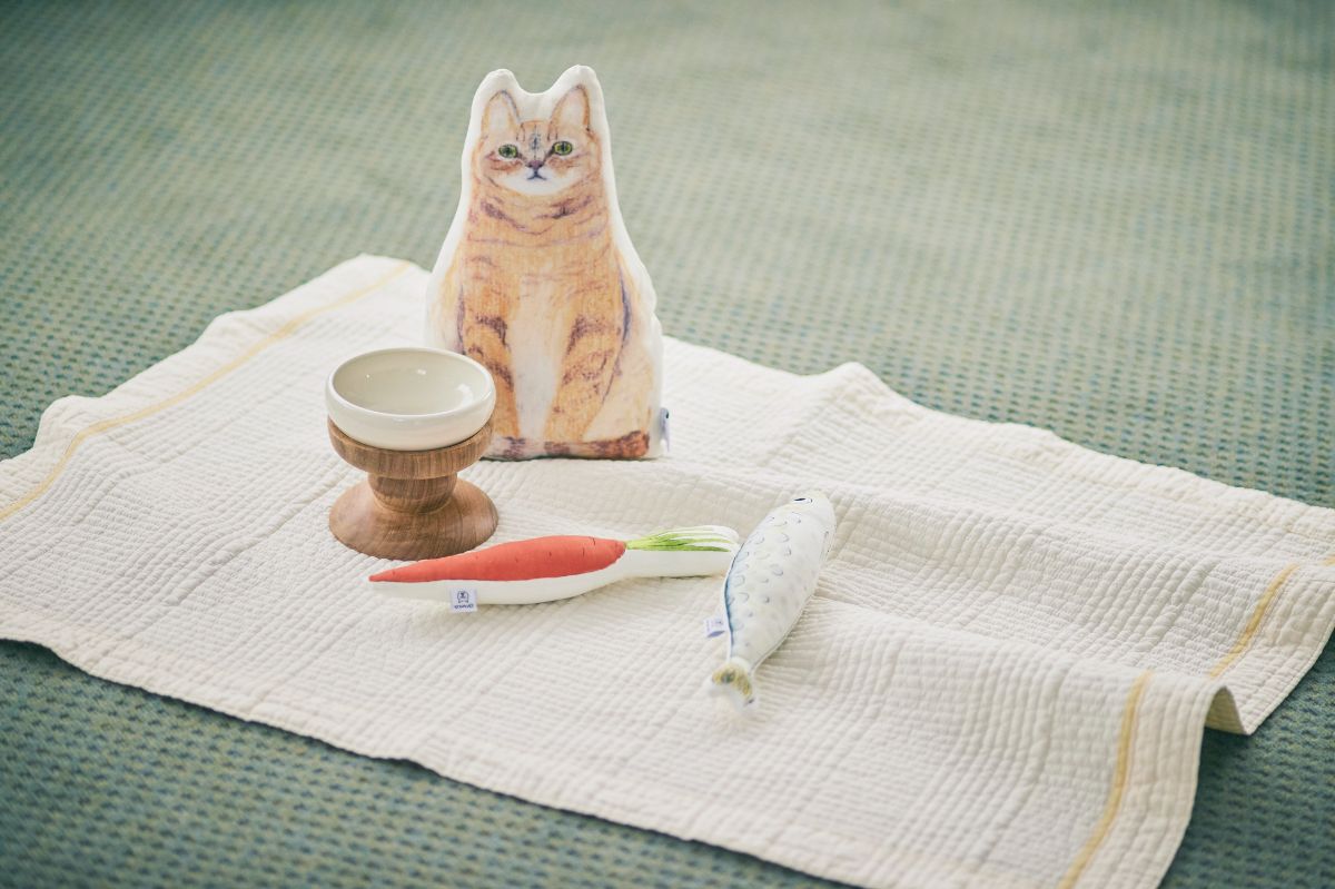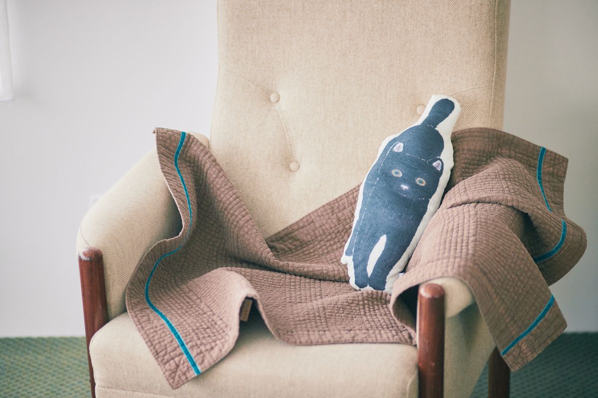 「イブルは汚れてもすぐに洗えて乾くので、清潔に保ててペットも人も安心。ラグやひざ掛け、お昼寝マットなどにちょうどいいサイズにしました。それと、オルネ ド フォイユのネコのインテリア『オルネコ』は、かわいくて使い勝手がよくて大好き。マットと一緒に使っていただけたら」