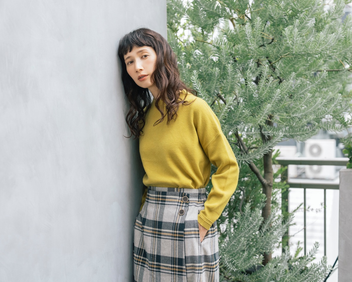 コートを脱いでも着映えする着こなしに。ほどよく華やかなマスタードイエローのニットが差し色になり、落ち着いたチェック柄が季節感を引き立てます。