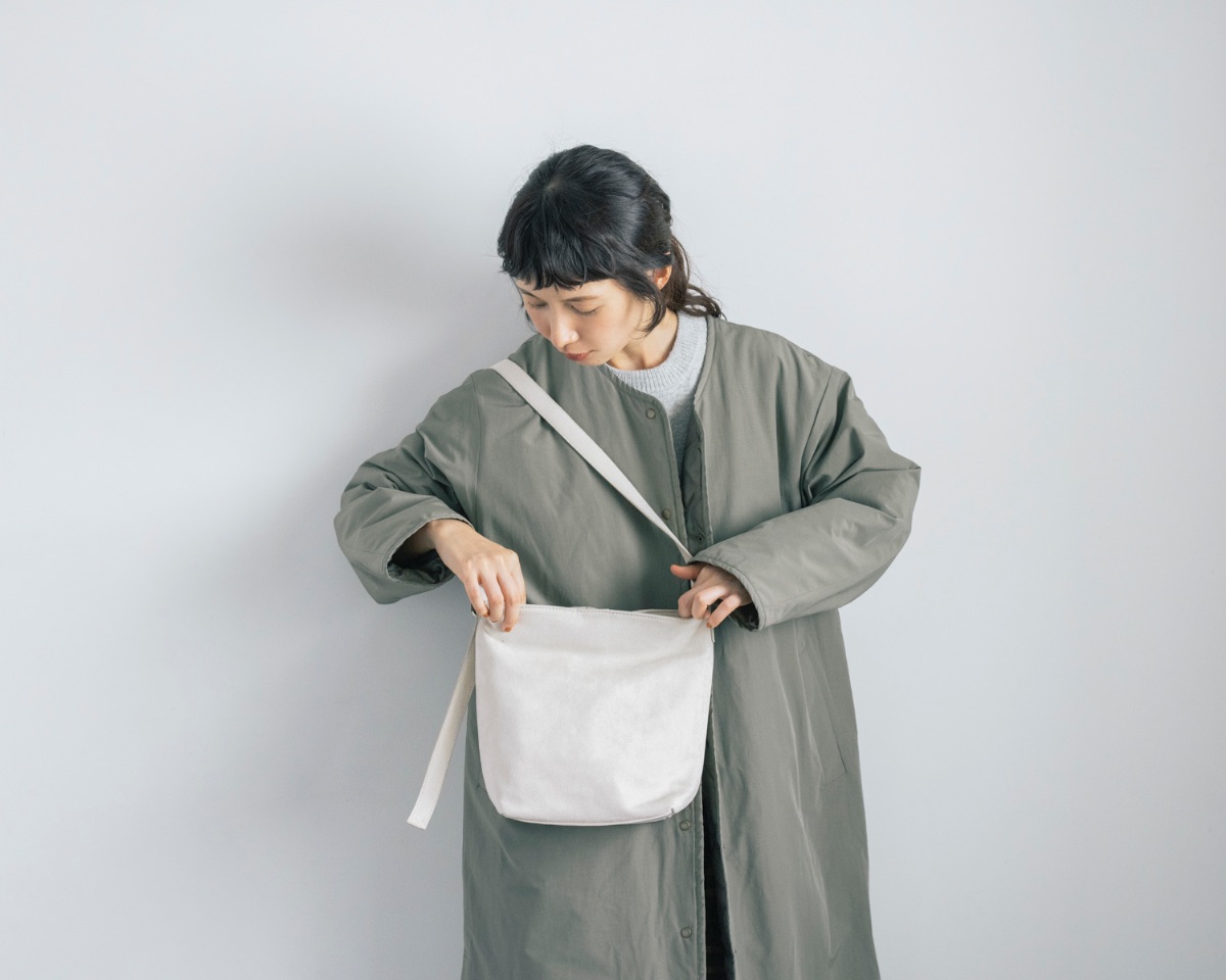 マットな質感で落ち着いたトーンのコートに、スウェード調のバッグでやさしいアクセントと、ほんのり温もりをプラス。異素材の組み合わせが奥行きを生み、装いを軽やかに見せてくれます。
