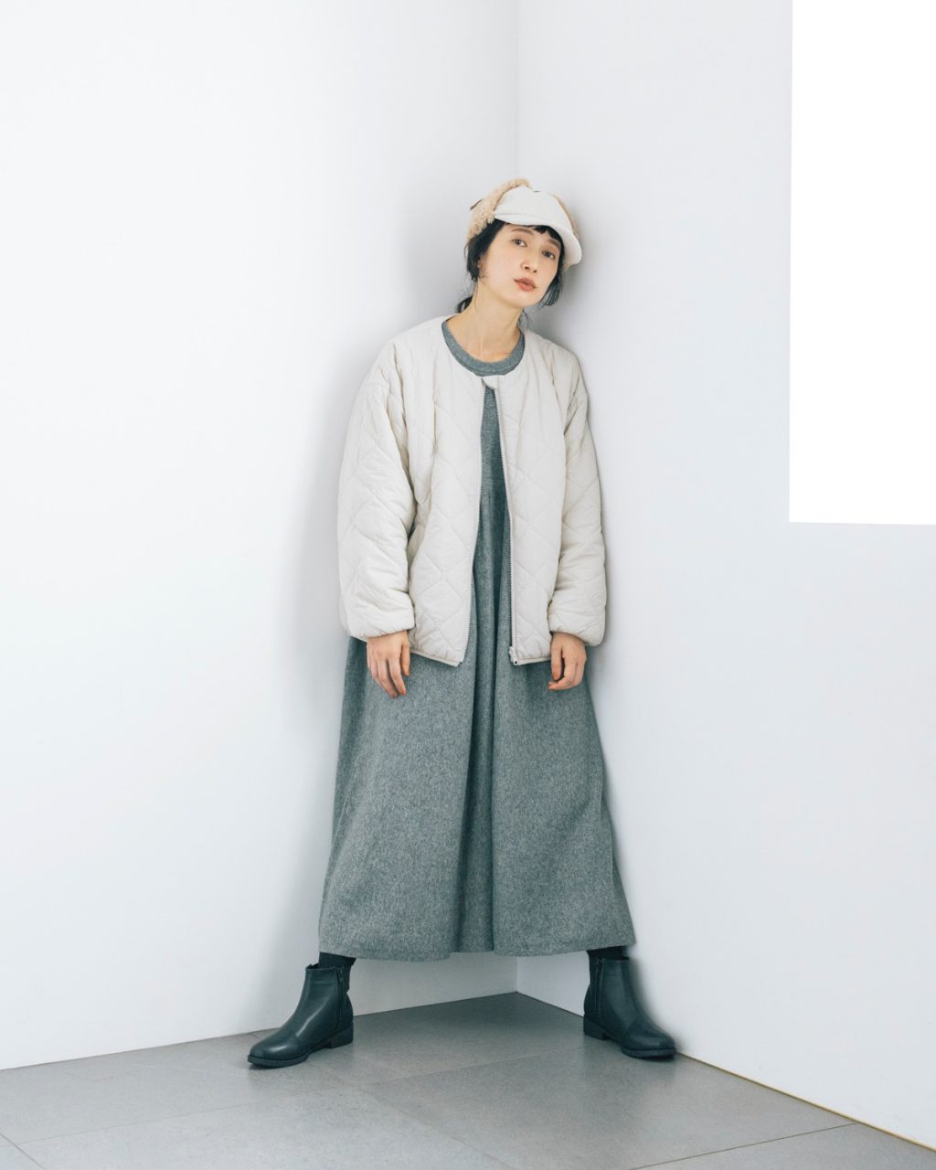 キルトリバーシブルジャケット¥5,489、ニットワンピース¥5,489、フライトキャップ¥3,289、サイドゴアショートブーツ¥3,289/すべてツクル&リン(シャンブル)、タイツ/スタイリスト私物