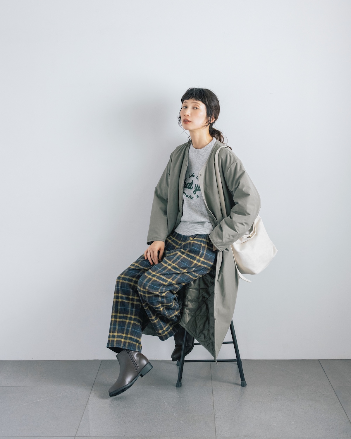 ロングコート¥7,689、ロゴニットプルオーバー¥3,949、チェック柄パンツ¥5,049、ショルダーバッグ¥3,729、サイドゴアショートブーツ¥3,289/すべてツクル&リン(シャンブル)