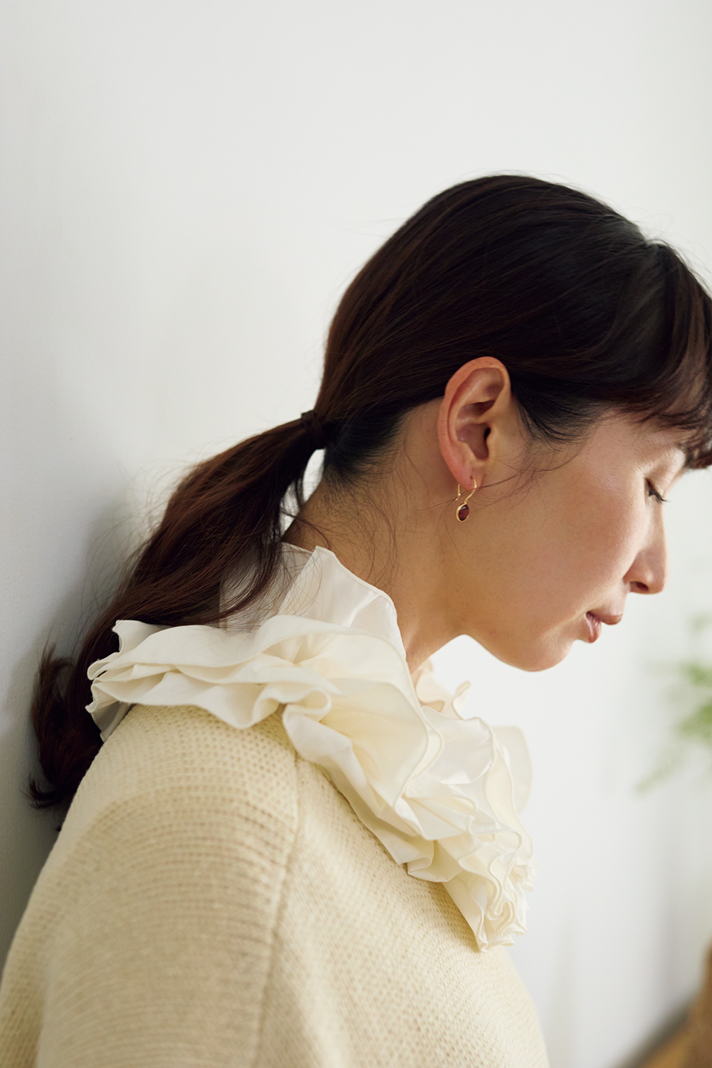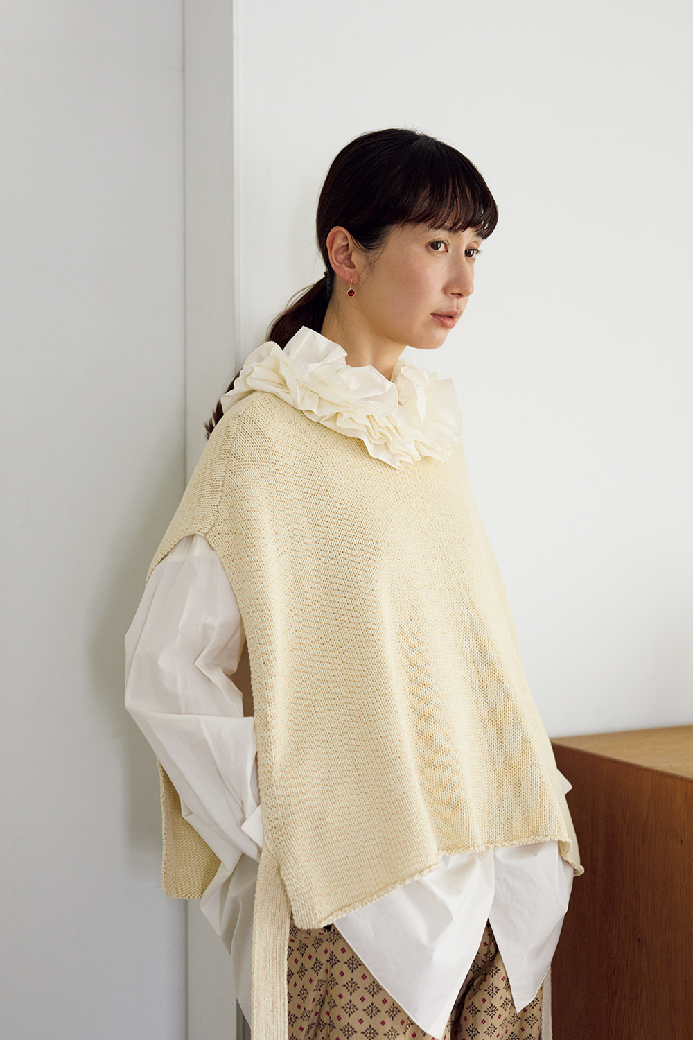 フリルブラウス¥63,800/スザンヌ ボマー(ウールン商会)、ニットベスト¥24,200/ヴェリテクール(ヴェリテクール)、パンツ¥24,200/メゾン ド ソイル(メゾン ド ソイル 恵比寿店)、ピアス¥154,000/マリハ(マリハ)