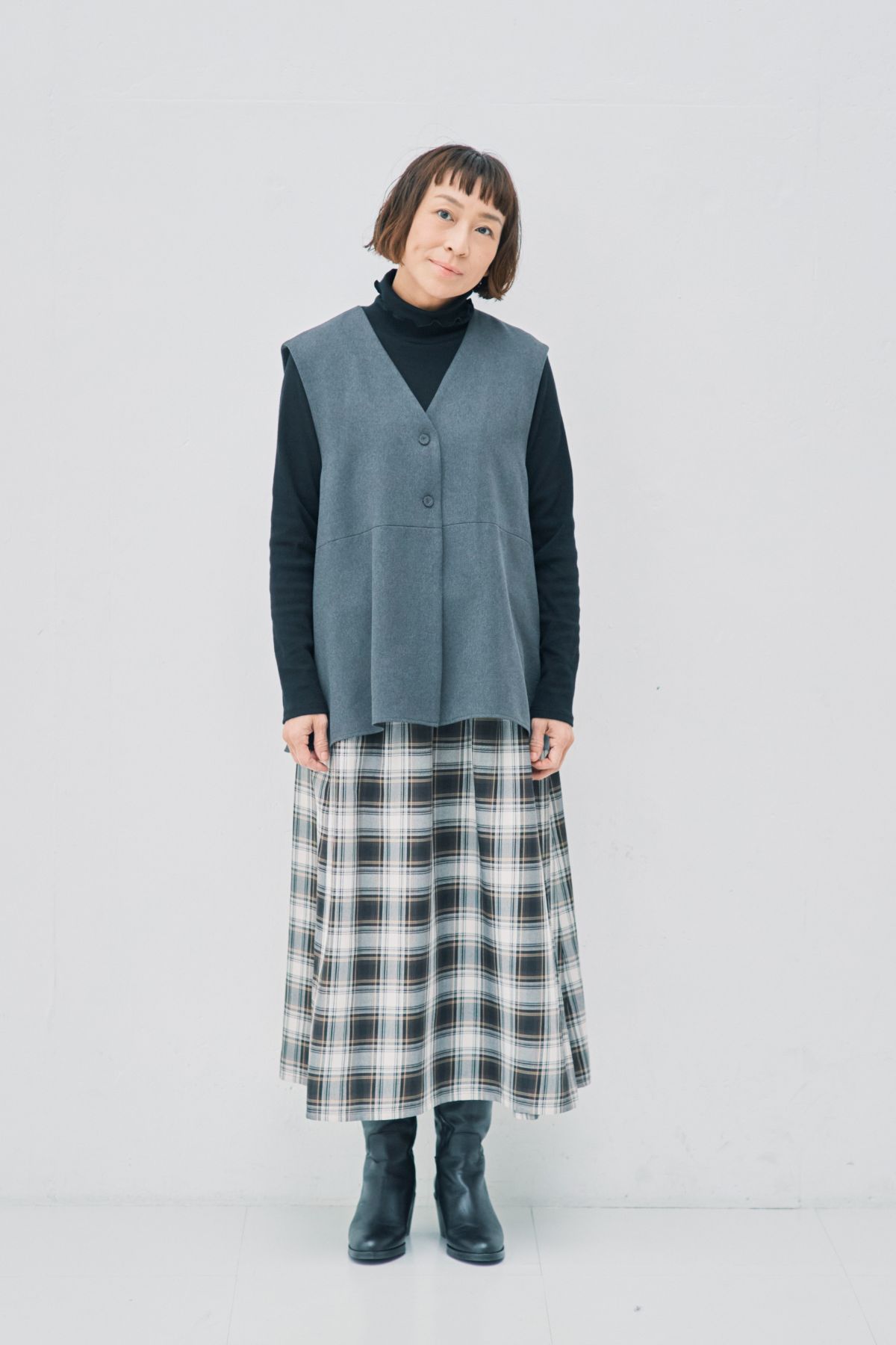 「Vネックのジレは黒のタートルネックとも相性がいいんです。チェックをきかせて、今年らしいクラシカルな雰囲気に」