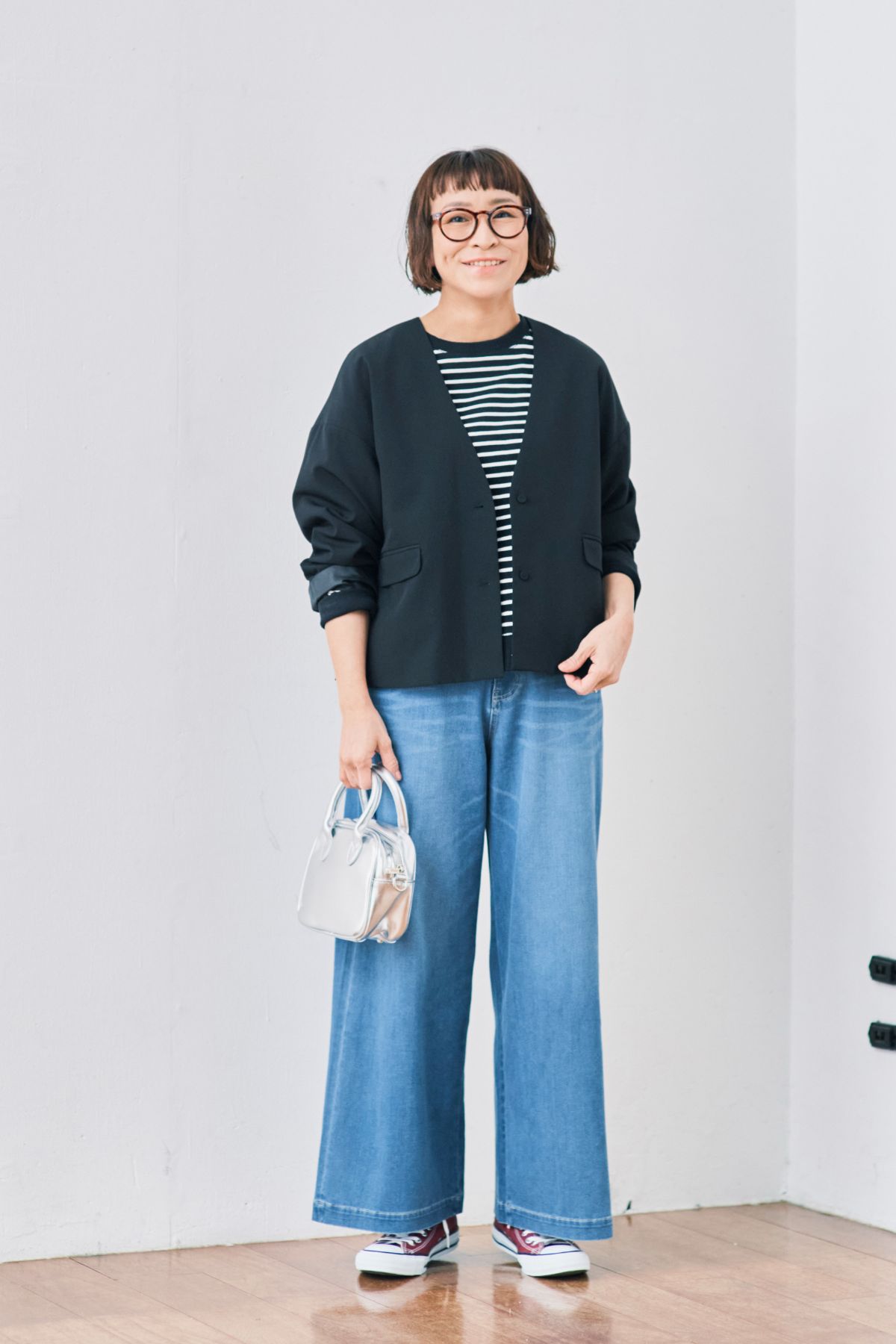 「デニムパンツでカジュアルダウン。インに黒いボーダーを着ると、ジャケットと色がなじむのでおすすめです」(佐藤かなさん 以下同)