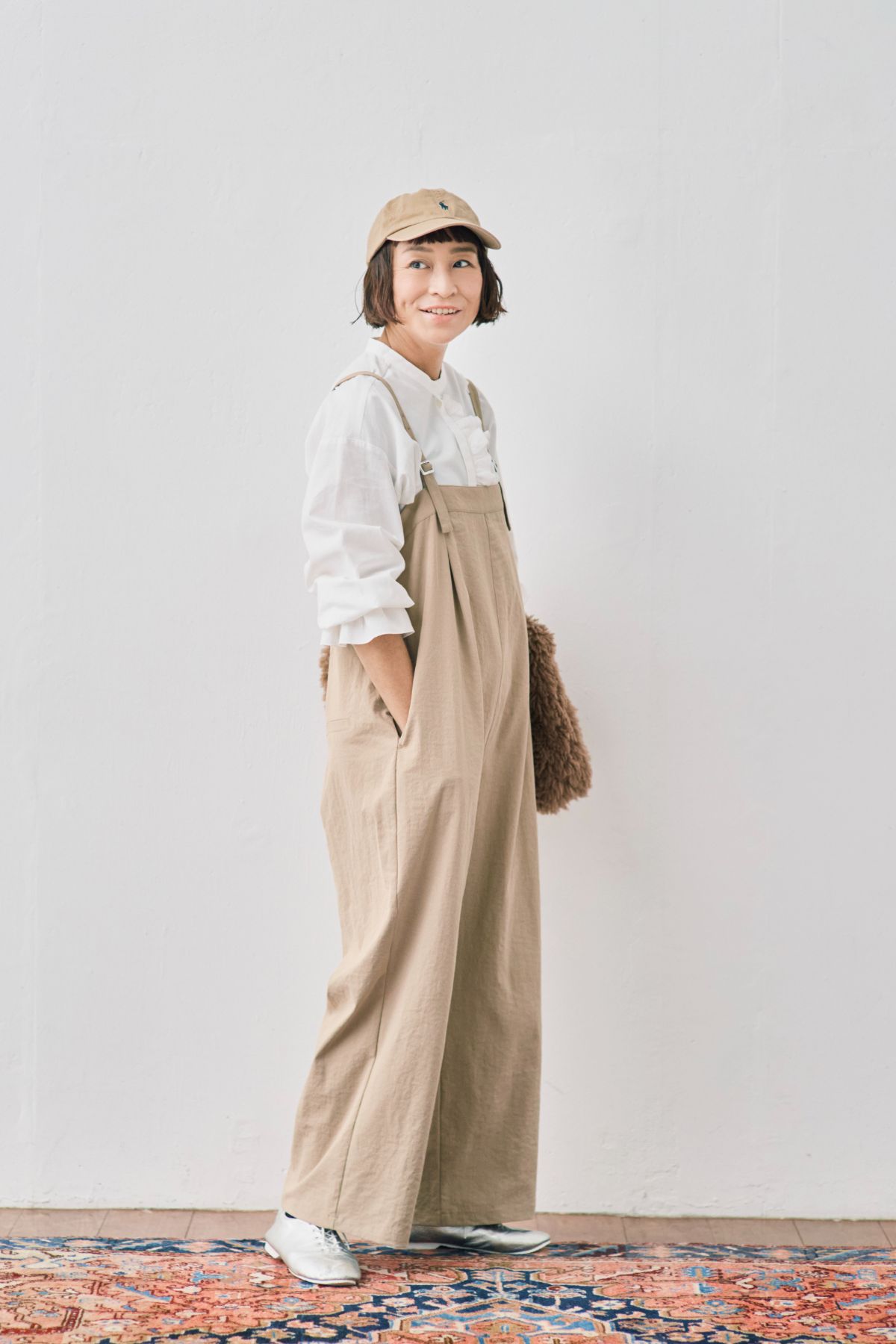 「コットンのフリルブラウスはカジュアルな装いにも大活躍。サロペットとキャップのラフなスタイルも大人っぽく見違えます。ベージュ×白で爽やかにまとめました」