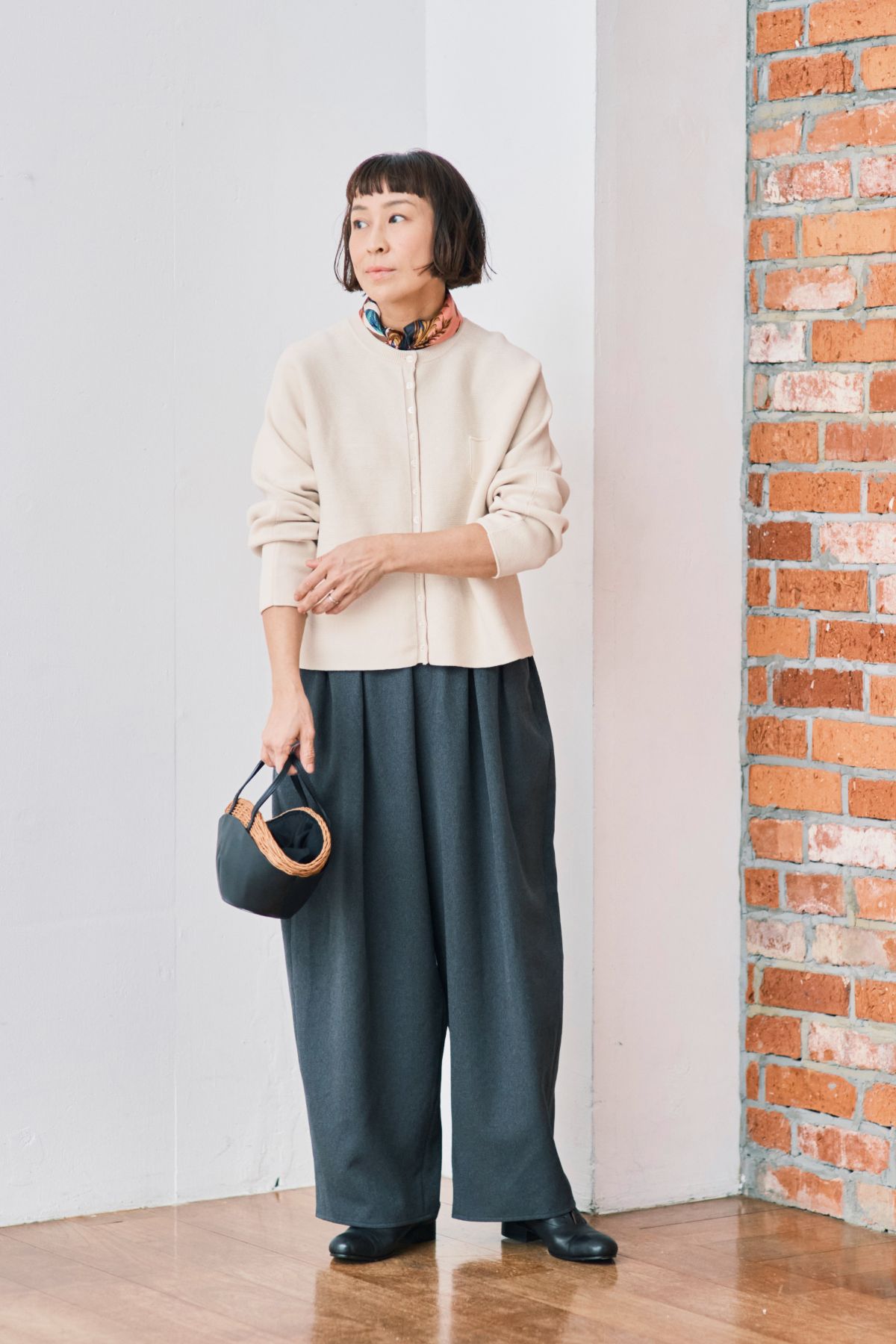「大人っぽくてきれいめのカーディガンにスカーフを合わせて華やかに。マニッシュなパンツを上品に着こなしました」