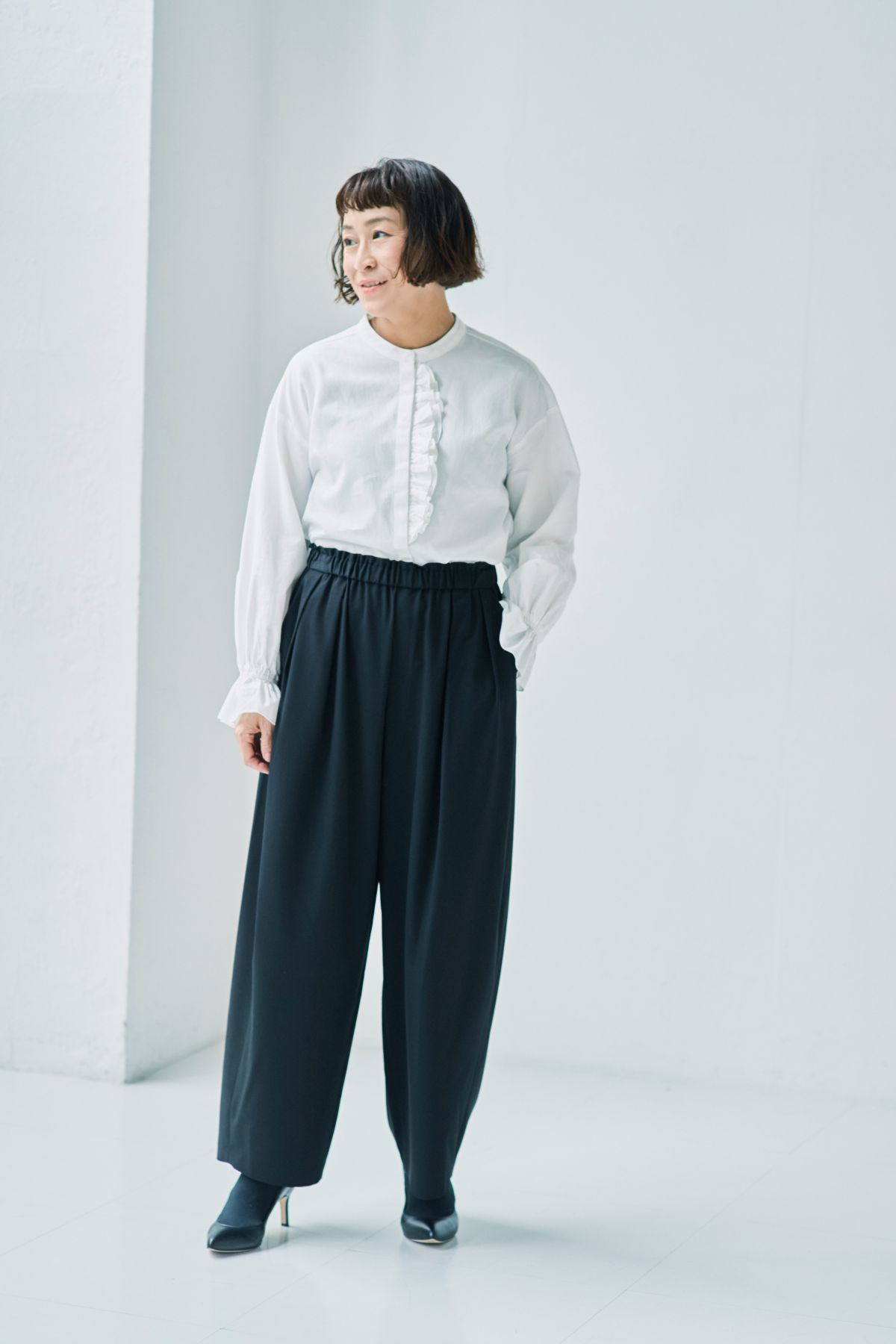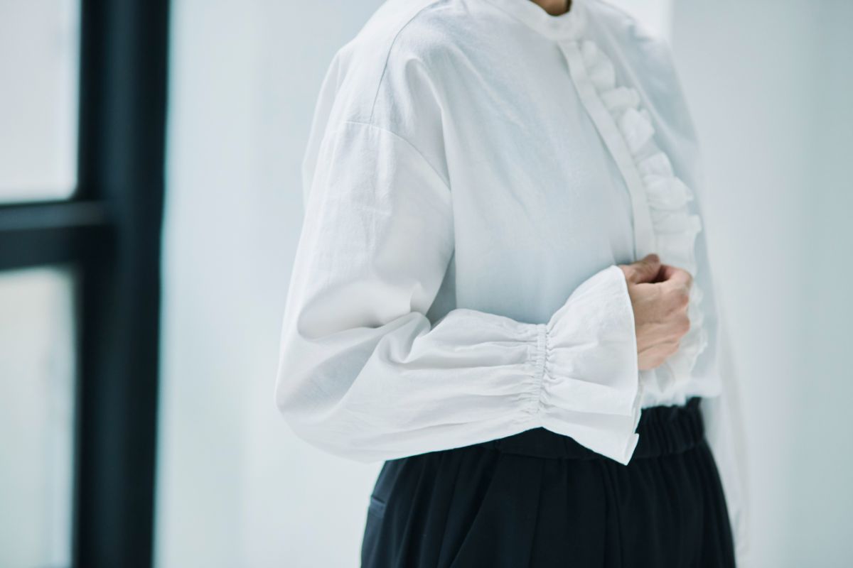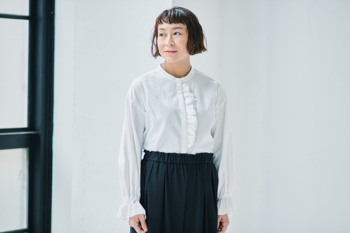 カジュアルにもハレの日にも似合うフリルの分量を調整。派手すぎず、ナチュラルな雰囲気をキープしました。フリルのおかげで顔まわりが華やぐので、アクセサリーいらずのブラウスです。