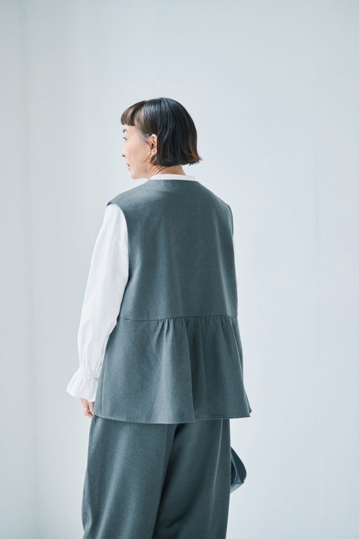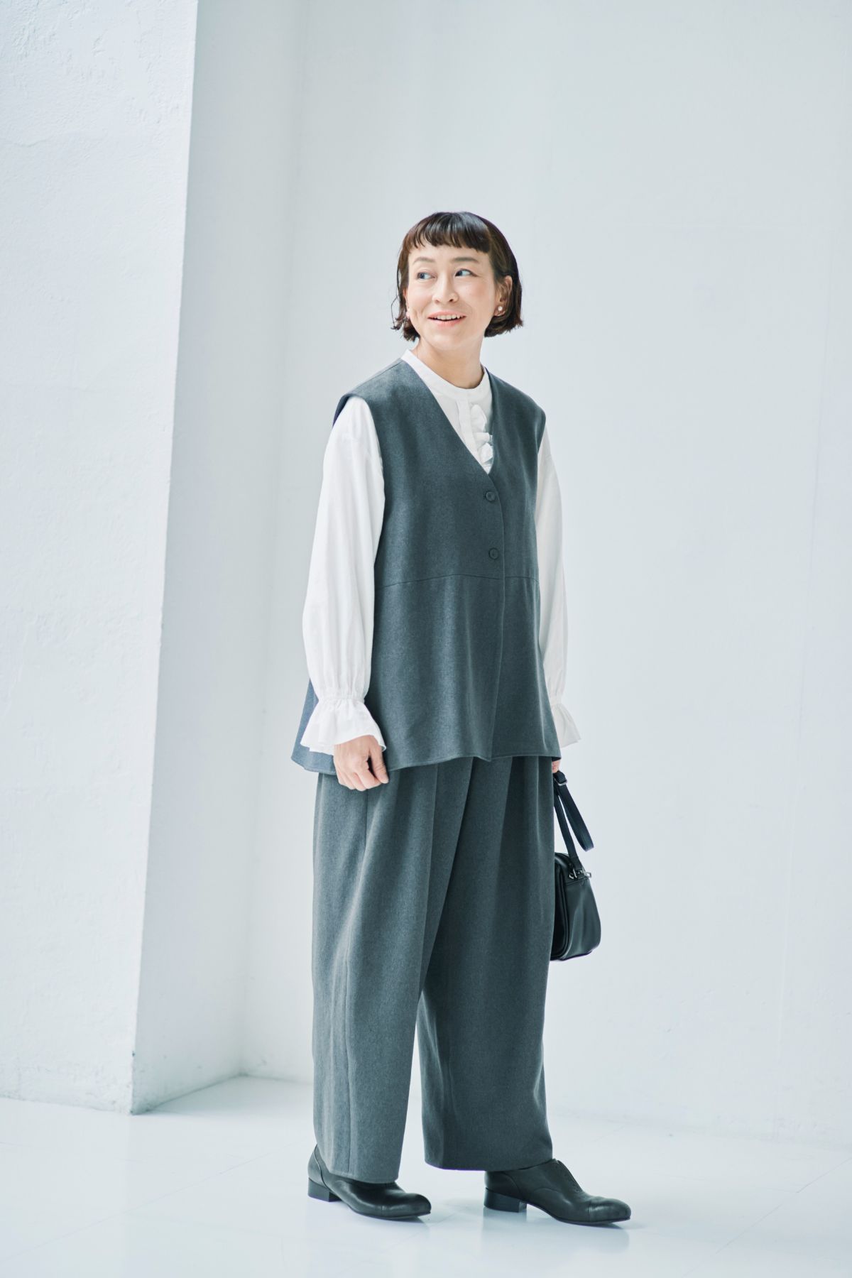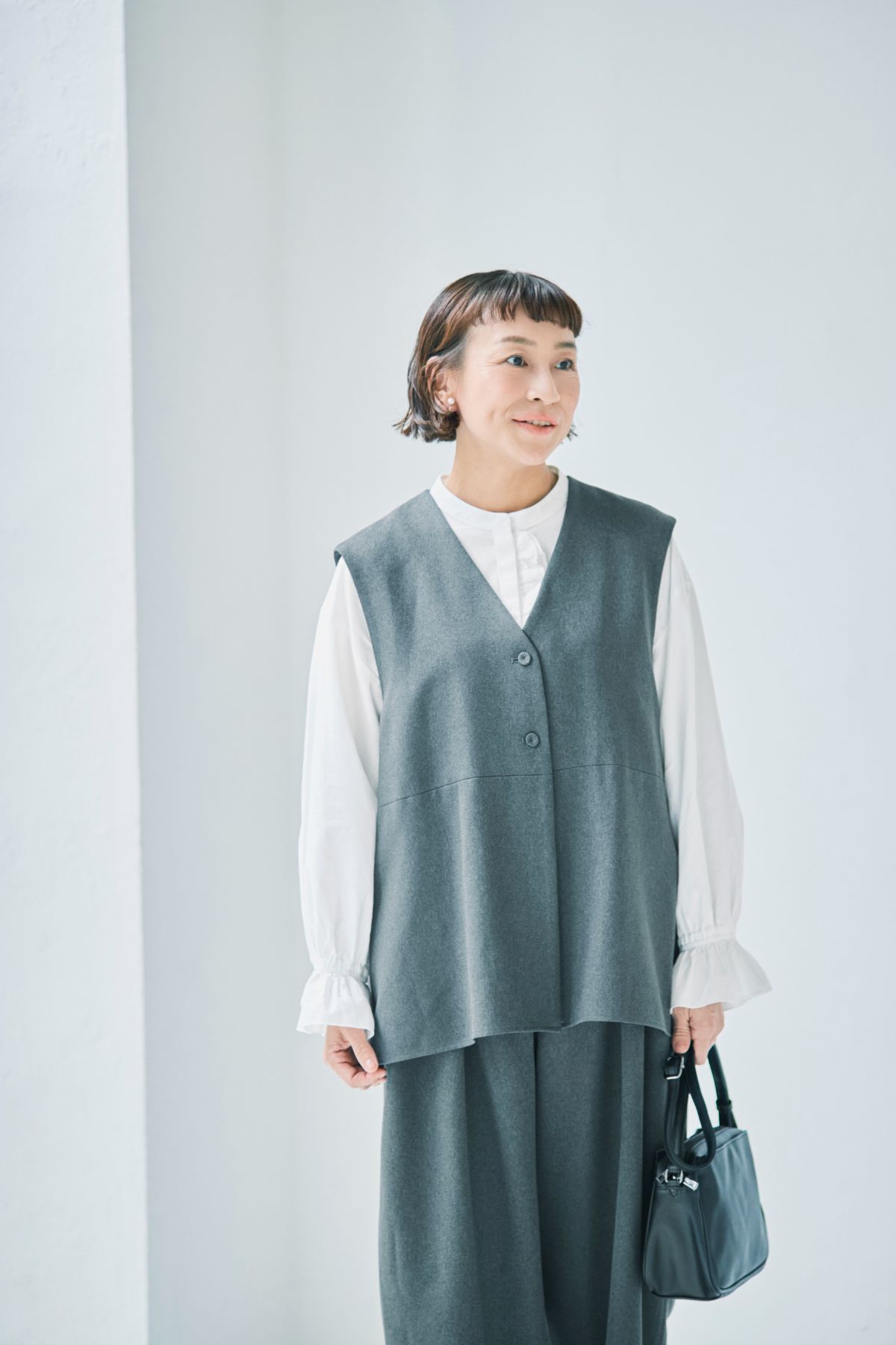 着まわしに使えるジレは、カジュアルな服にも合わせやすいチャコールグレーをセレクト。あえて表情のある素材を選んで、黒と変化をつけました。インにはタートルネックやロンTなどを合わせてもサマになります。デニムとも相性がいいです。