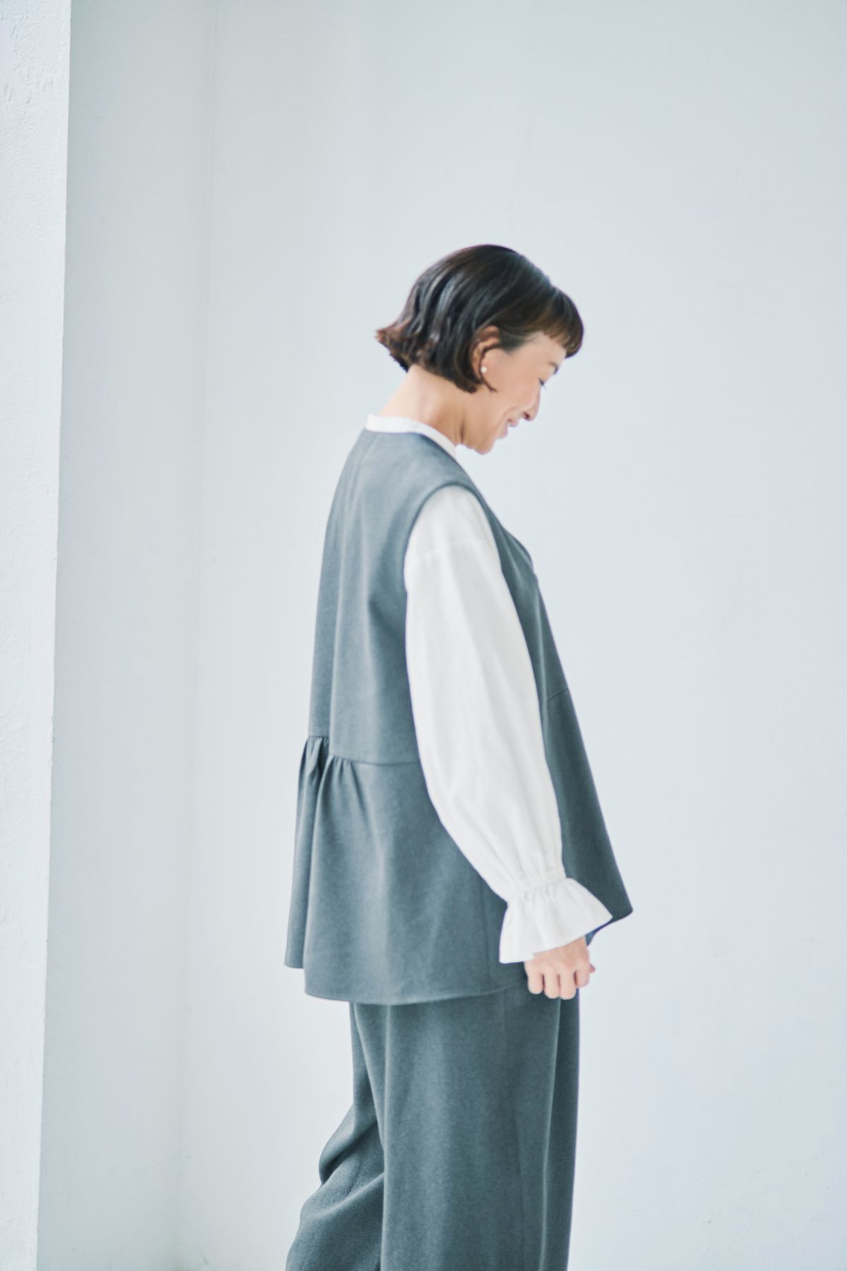 きちんと感がありながら、ゆったりとはき心地のいいパンツをつくりました。大人が上品に美しくはけるシルエットを吟味。セットアップはもちろん、単品でも活躍します。ラクにはけてすっきり見えるので、コクーンシルエットが初めての方でも気負わずにはいていただけます。