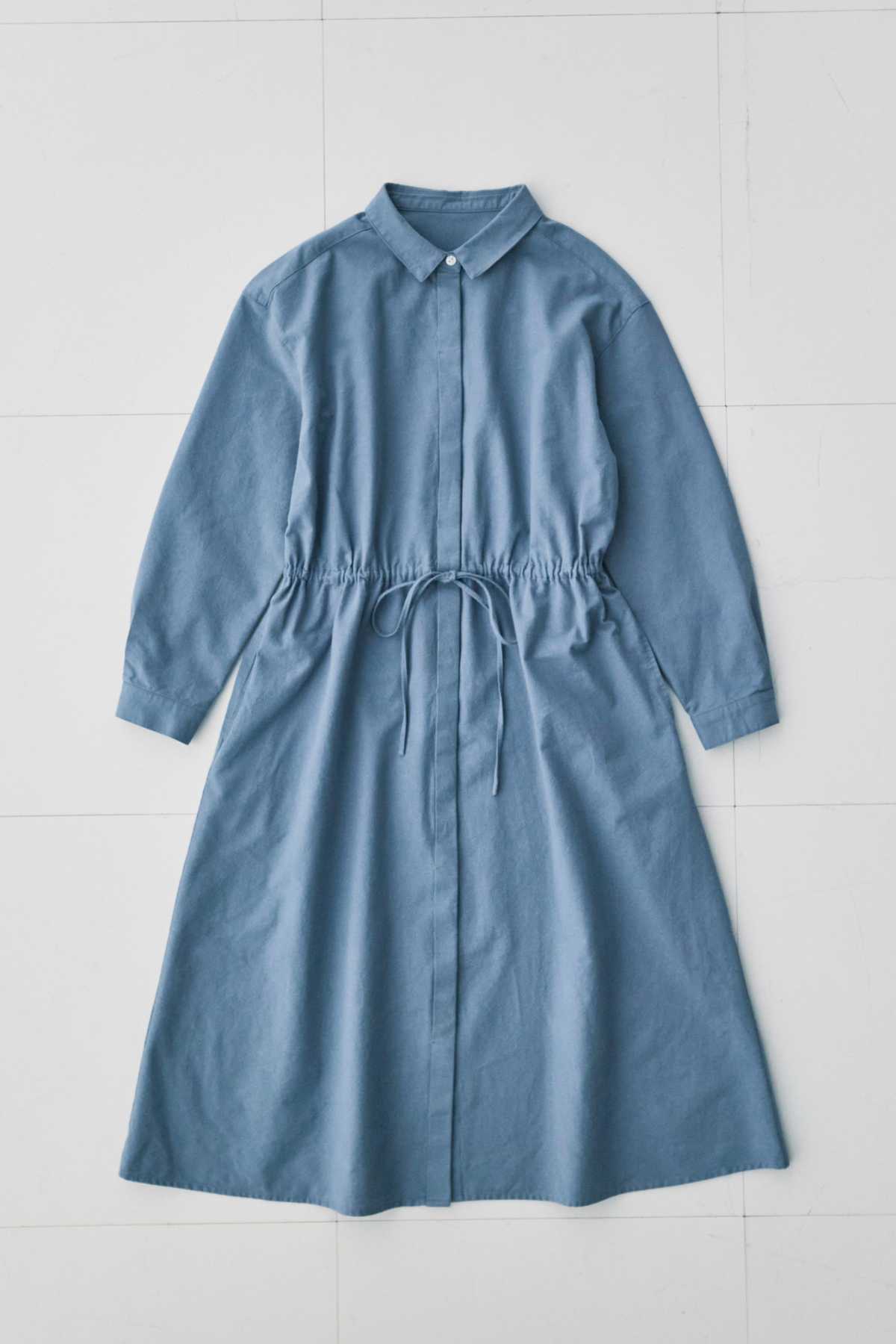 少し厚みのある生地でワーク風に仕立てました。体の線を拾わないので、一枚でも、はおってもシルエットがきれいです。比翼仕立てなので、前ボタンを留めるとすっきりとした印象に。ウエストのリボンを絞ったり、ゆるめたりして形を調節できます。