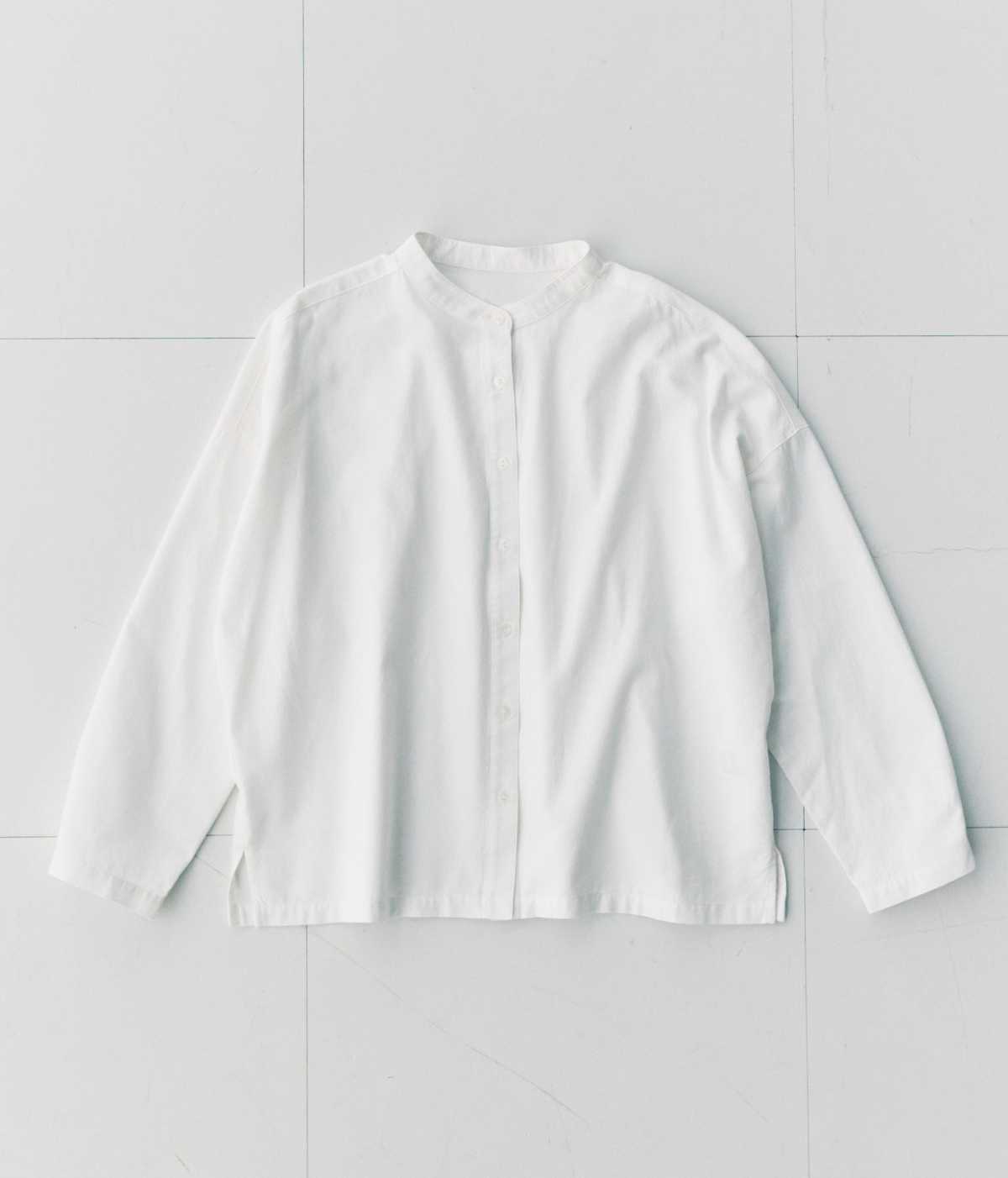 顔まわりがすっきり見えてジャケットにもニットにも合わせやすいスタンドカラー。コーディネートしやすく、着まわしで大活躍。