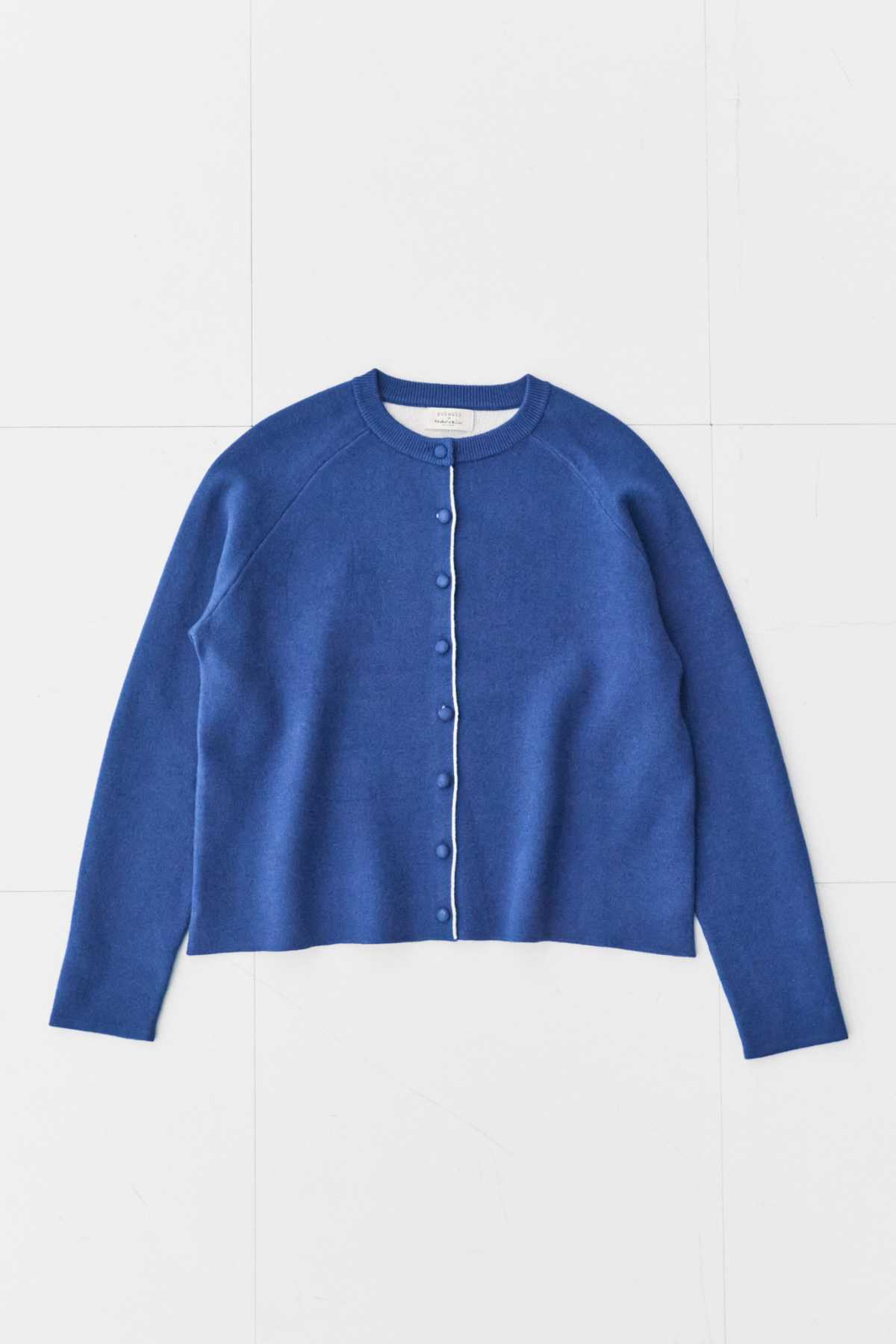 トラッドな着こなしに似合う、きれいめのカーディガンがほしくてつくりました。もっちりした風合いで着崩れしにくく、品よく着こなせます。ラグランスリーブなので肩まわりがラクで、かっちりしすぎないところもポイント。どのアイテムにも合うように、ブルーの色を吟味しました。