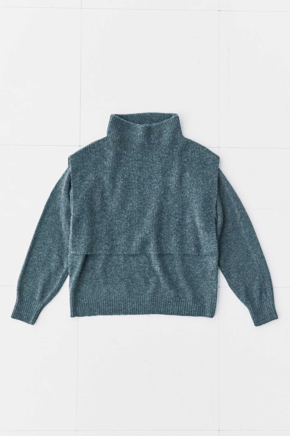 タートルネックのショルダーウォーマーと丸首セーターのセット。肩を包み込むウォーマーが着こなしに立体感を与え、冷えやすい首や肩まわりをふんわりと守ってくれます。