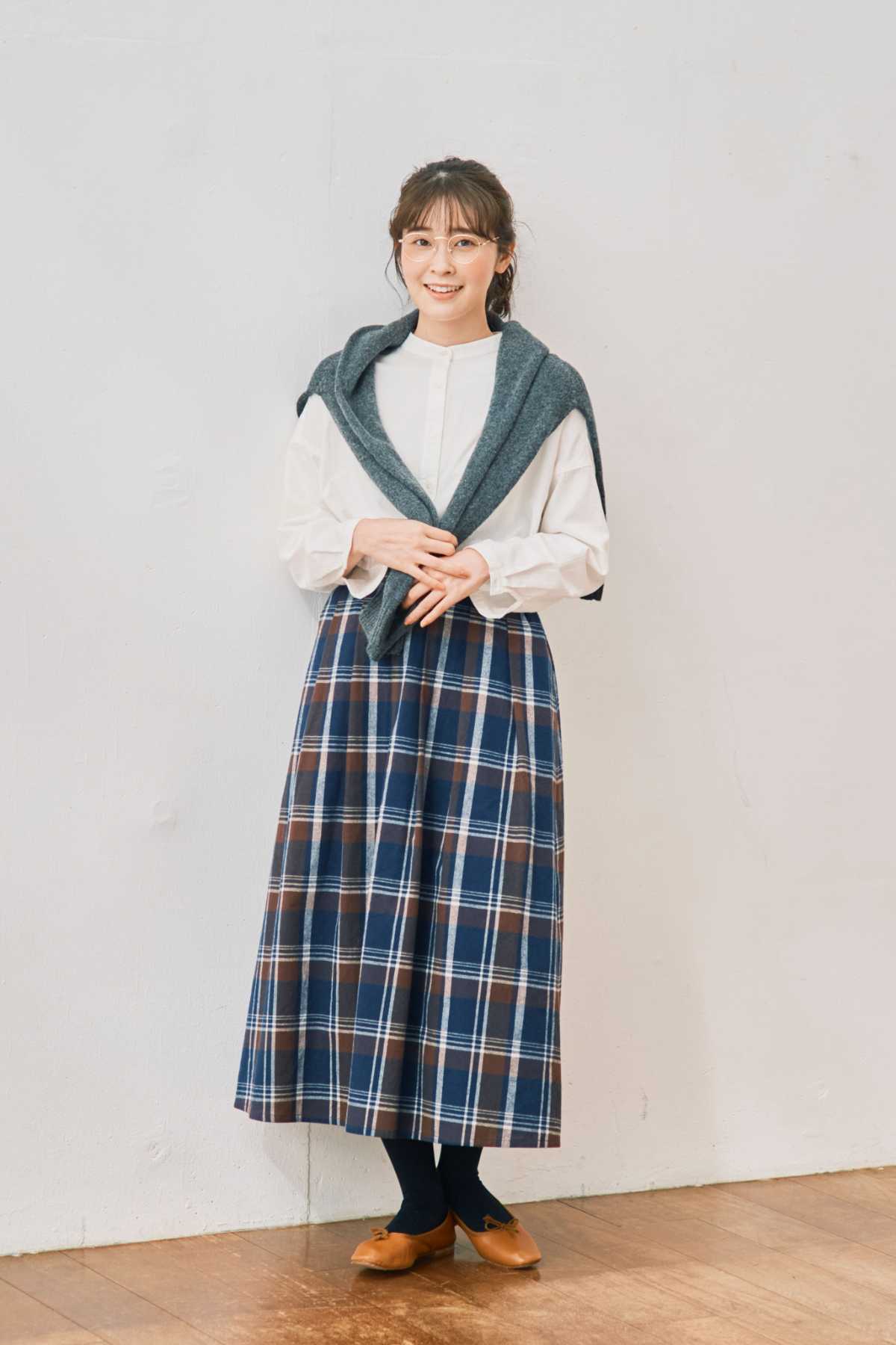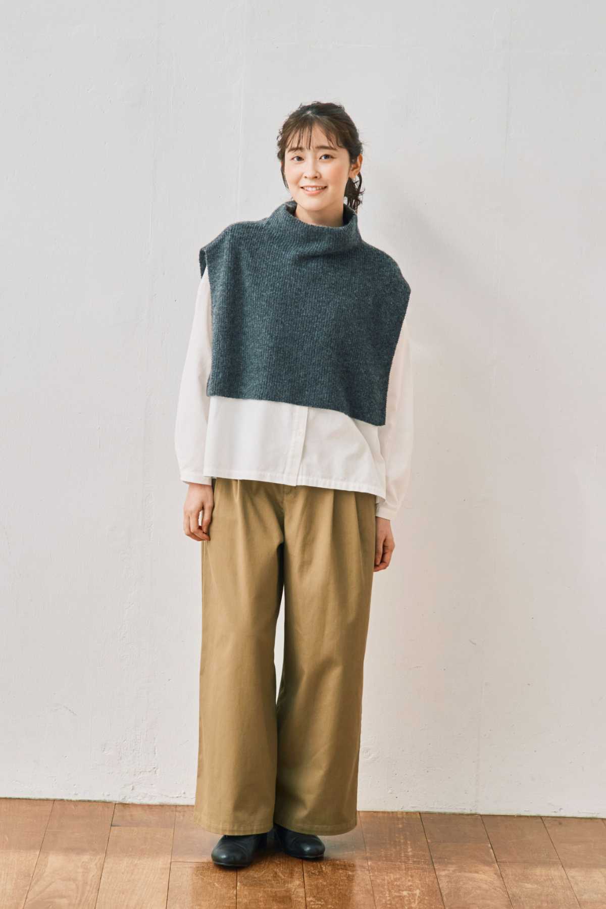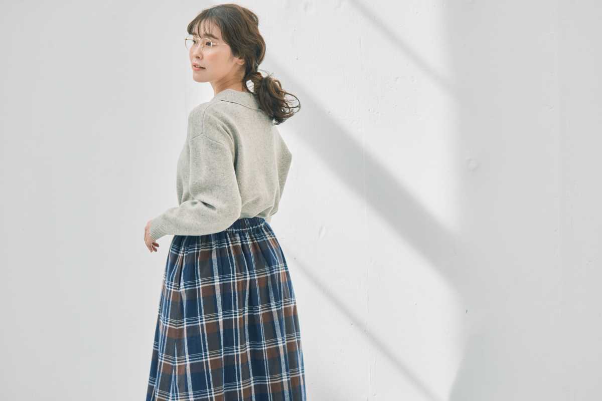 セットでもそれぞれ単品でも使えて、この福袋でイチオシのニット。手持ちの服に合わせやすいように、チャコールグレーにしました。ほかのアイテムや手持ちの服とも組み合わせられるので、着まわしに便利です。パンツはもちろん、スカートに合わせてもかわいい。二枚重ねれば、首もとや肩まわりがあたたかくて快適です。