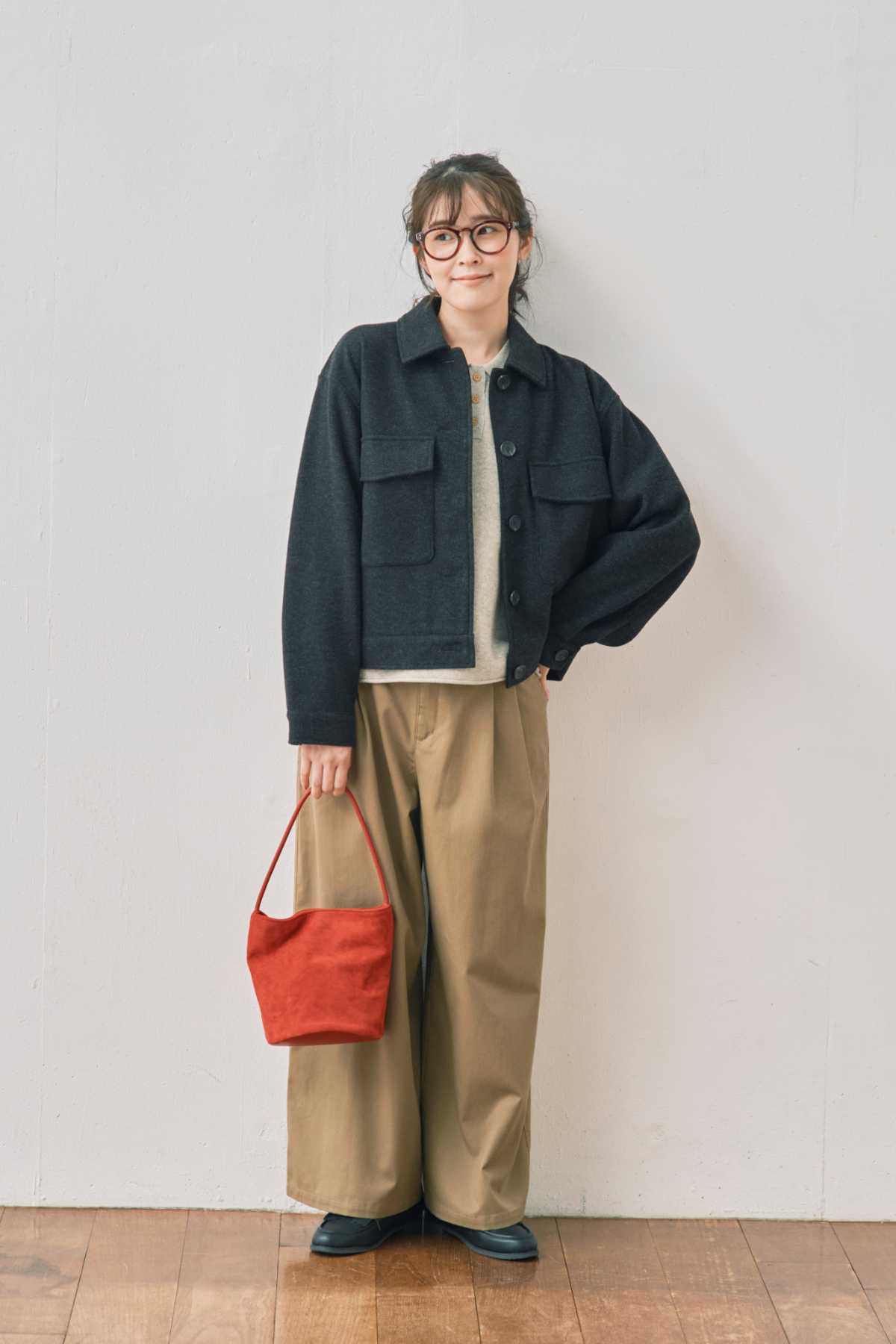 「ワーク風のディテールを取り入れて、マニッシュに仕上げました。軽くてゆったりしているので着心地がいいです」(ゆべしさん、以下同)