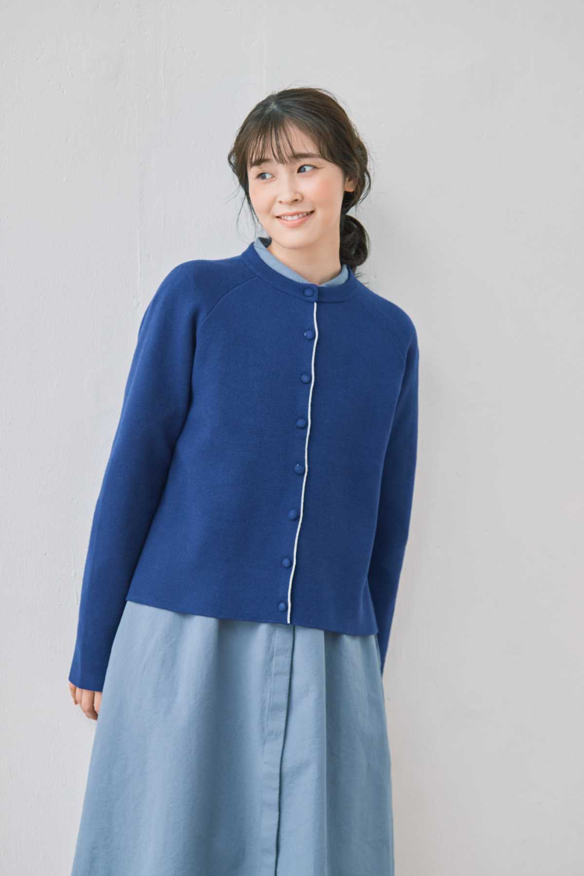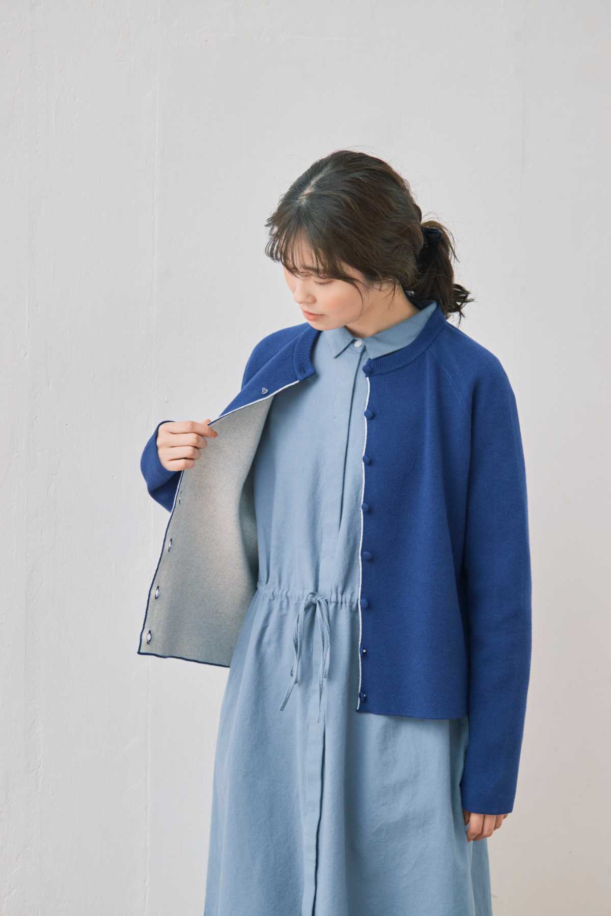 トラッドな着こなしに似合う、きれいめのカーディガンがほしくてつくりました。もっちりした風合いで着崩れしにくく、品よく着こなせます。ラグランスリーブなので肩まわりがラクで、かっちりしすぎないところもポイント。どのアイテムにも合うように、ブルーの色を吟味しました。