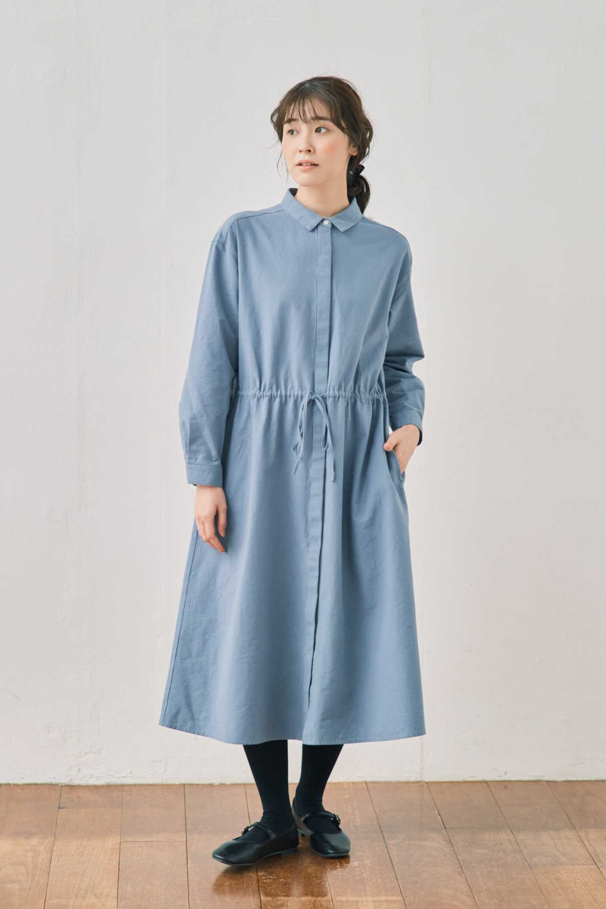 少し厚みのある生地でワーク風に仕立てました。体の線を拾わないので、一枚でも、はおってもシルエットがきれいです。比翼仕立てなので、前ボタンを留めるとすっきりとした印象に。ウエストのリボンを絞ったり、ゆるめたりして形を調節できます。