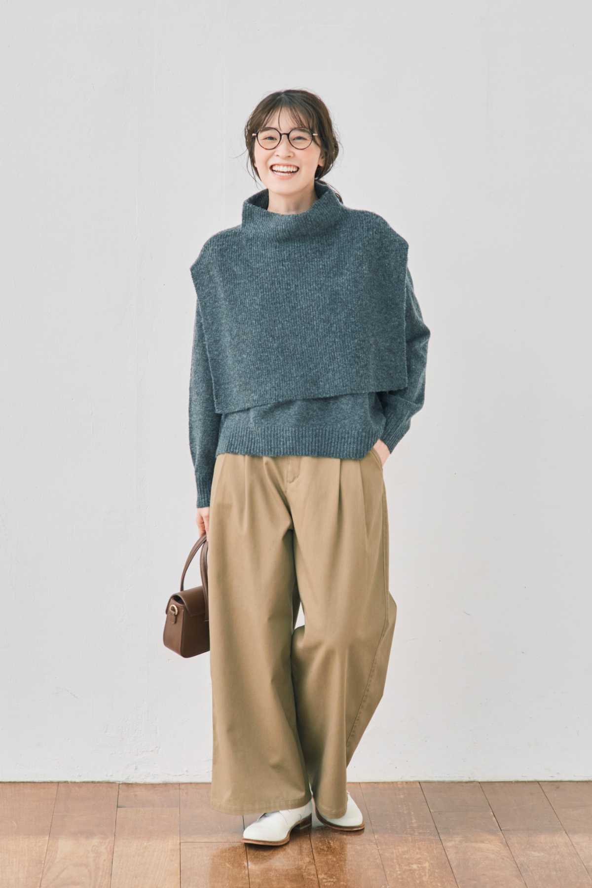 タートルネックのショルダーウォーマーと丸首セーターのセット。肩を包み込むウォーマーが着こなしに立体感を与え、冷えやすい首や肩まわりをふんわりと守ってくれます。