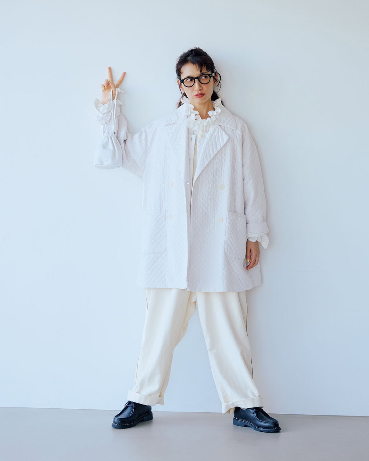 フリルやキルティングの甘さを、黒小物で引き締めたホワイトコーデ。やさしさと大人らしさを両立した佇まい。