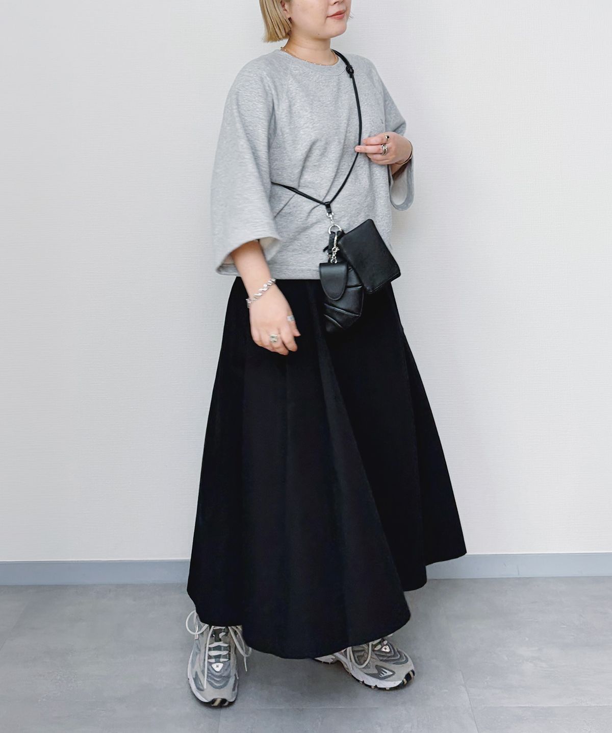 スウェットはハーフスリーブで春らしい抜け感を叶えつつ、レザーのショルダーバッグが、コーディネートのアクセントに。