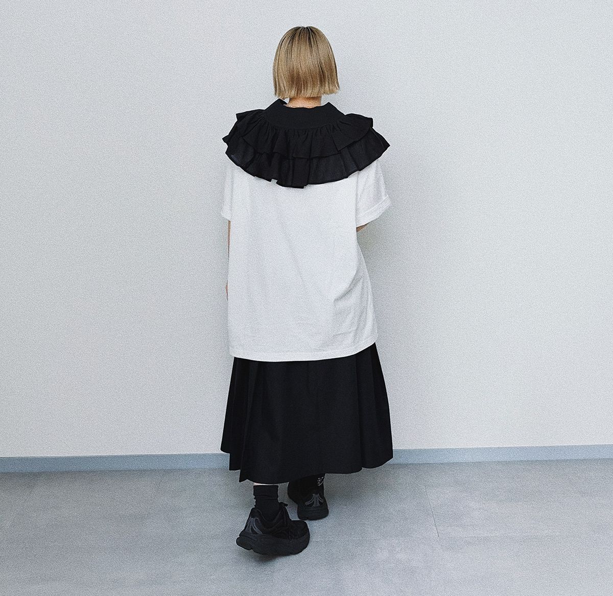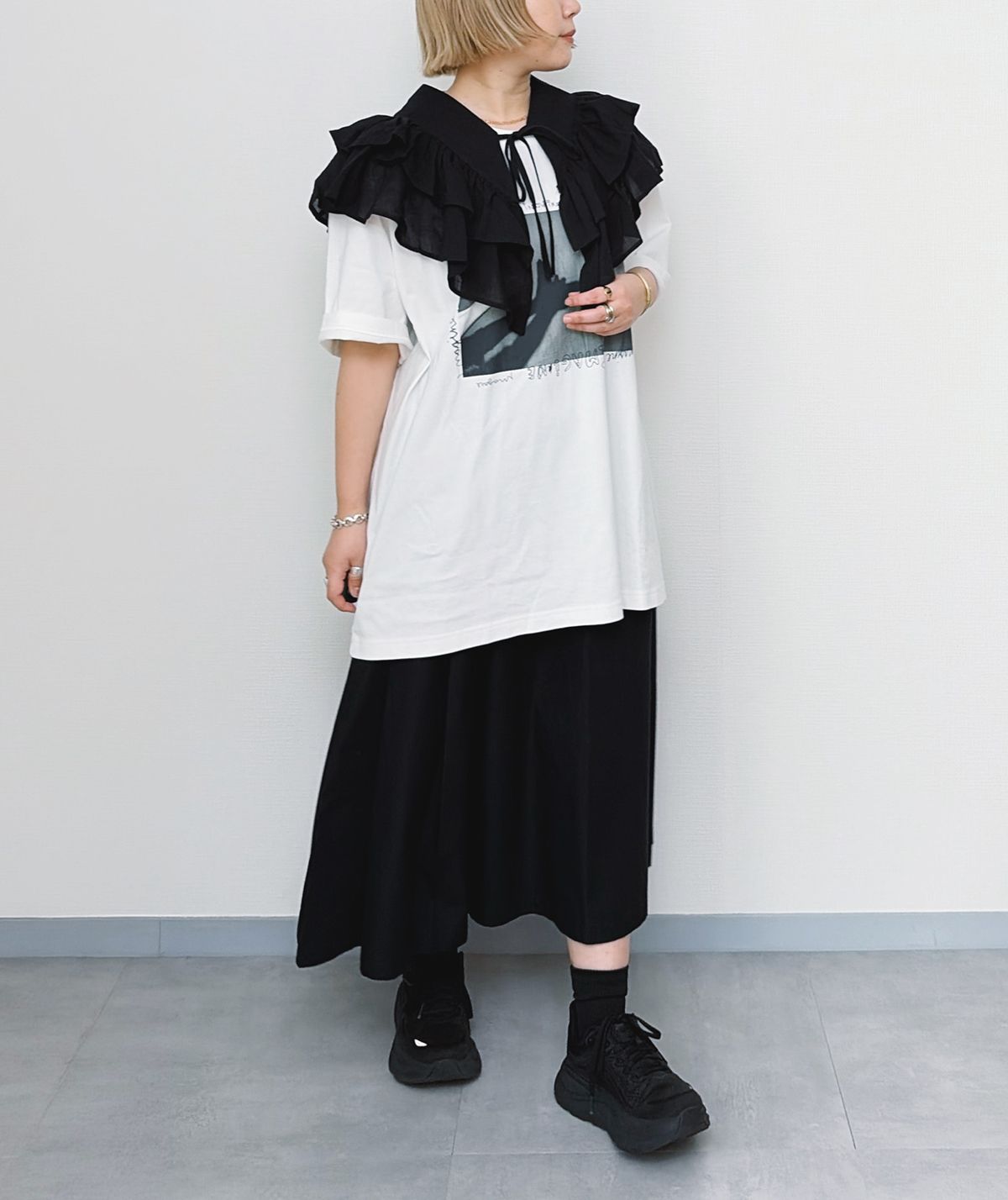 フレアスカートと、大胆なフリル襟、Tシャツのプリントをそれぞれ黒で合わせた上級者コーデ。