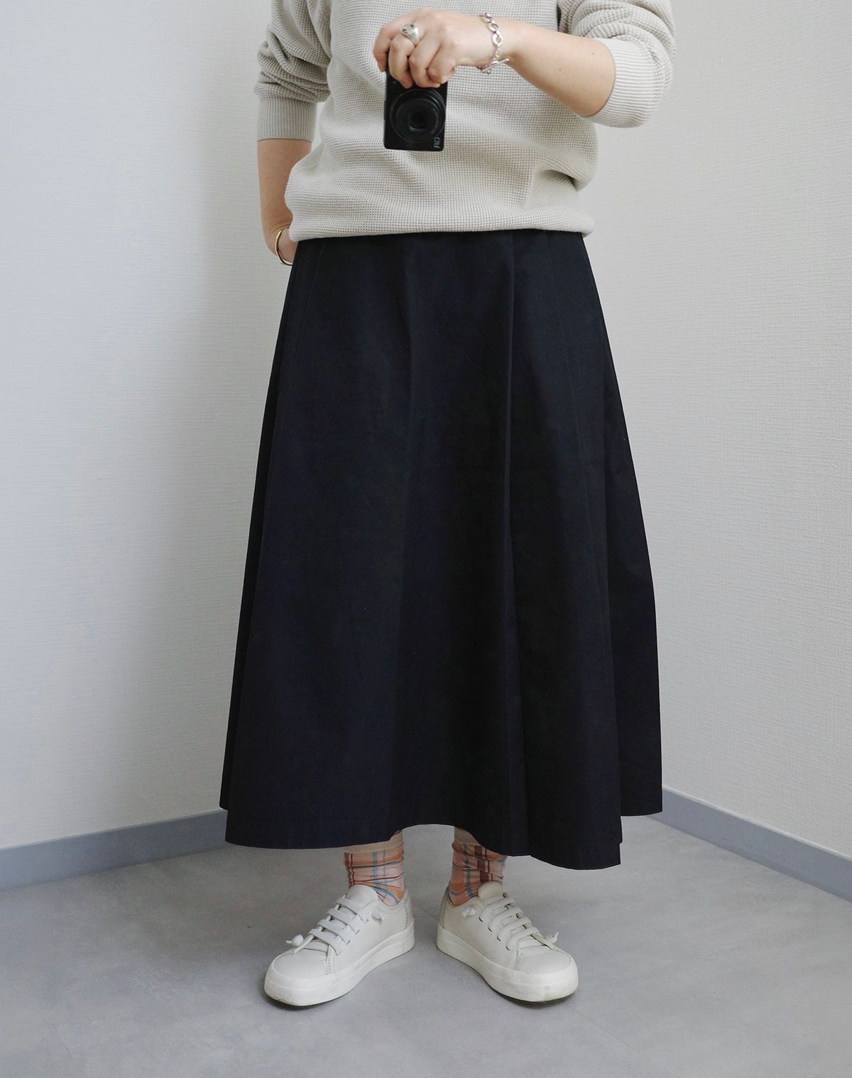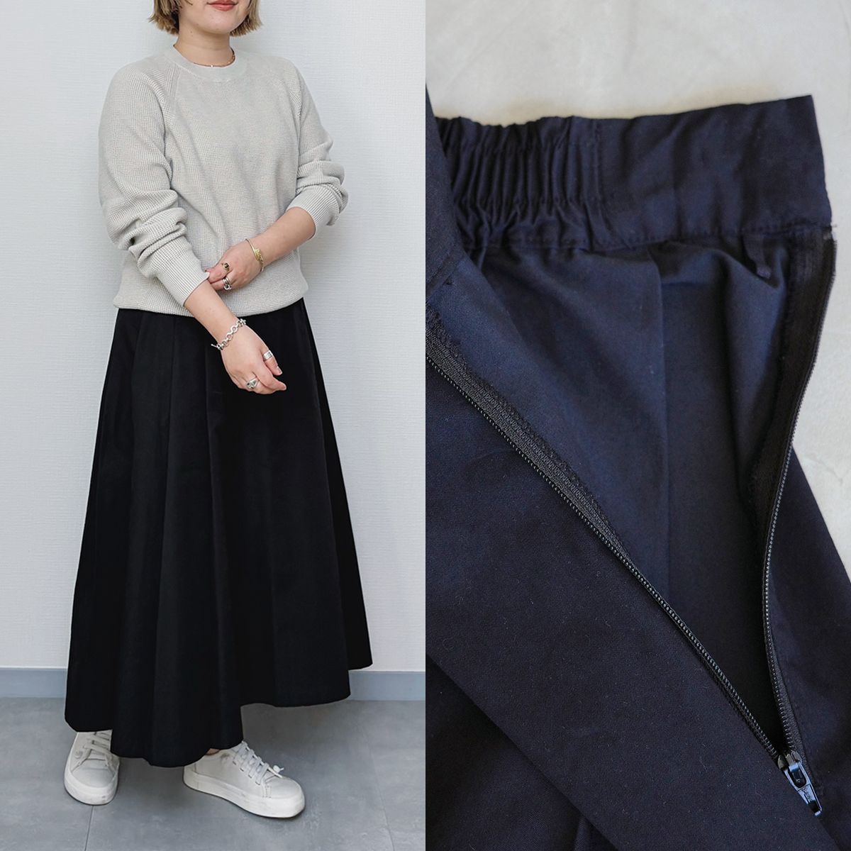 フレアスカートといえばふんわりとした印象にまとまりやすいですが、横にファスナーがあるので腰まわりがすっきり見えて、全体にメリハリのあるコーディネートにまとめられます。