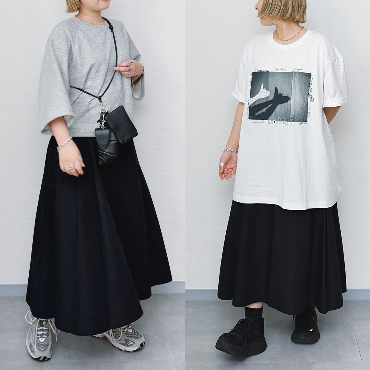 フレアスカートは、グレーでゆったりシルエットのスウェットと合わせてもラフになりすぎず、モードな雰囲気に。