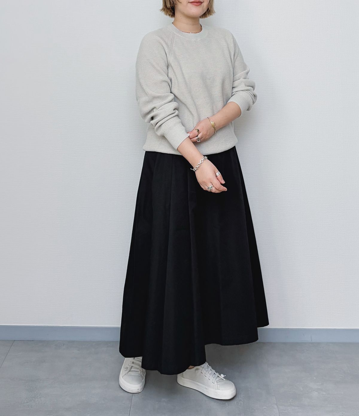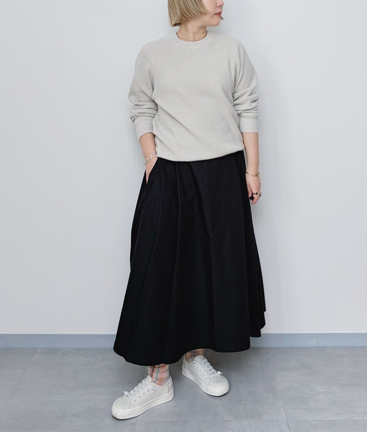 フレアスカートにワッフル素材のトップスを合わせて、軽やかな装いに。トップスのカジュアルな風合いを、スカートのハリ感で大人っぽく引き締めます。