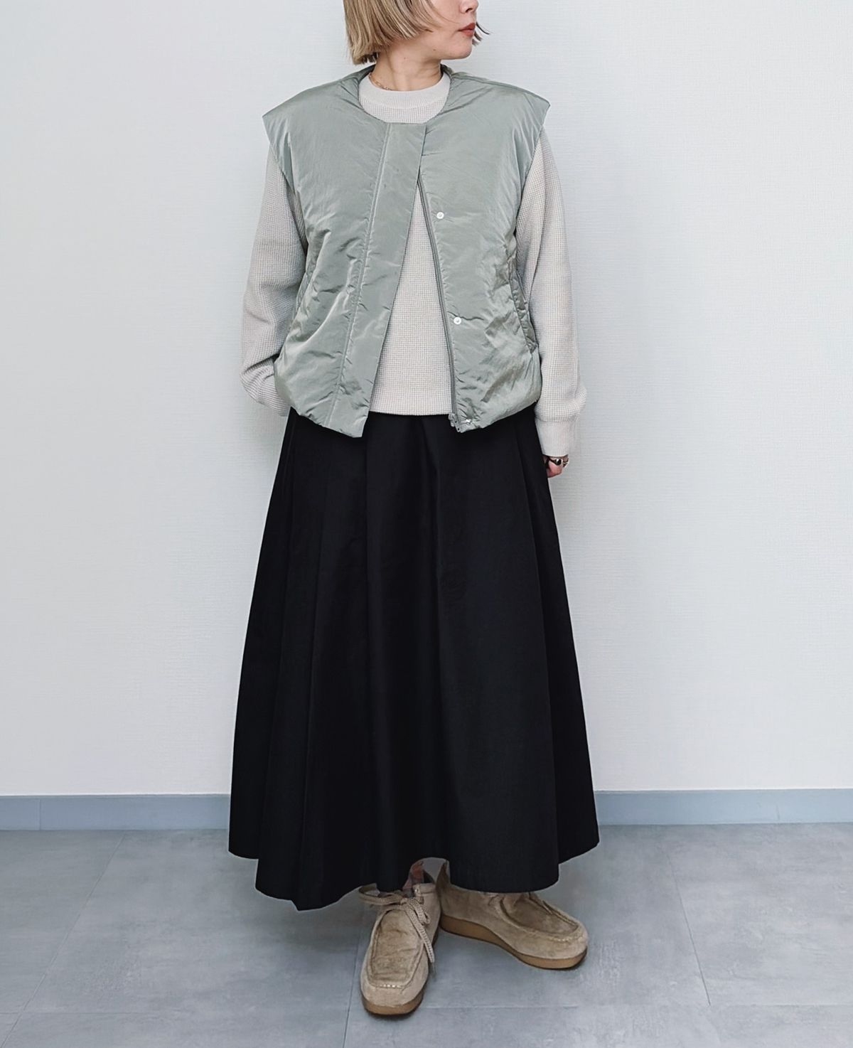 トップスは、ワッフルスウェットにニュアンスカラーの中綿ベストを重ねてナチュラルな印象に。