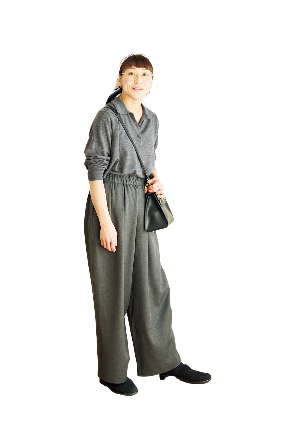 パンツとニットをグレーで統一し、スカーフが主役のエフォートレスルックを演出。ポロニットは襟を広げてVネック風にし、ニュアンスある首もとに。