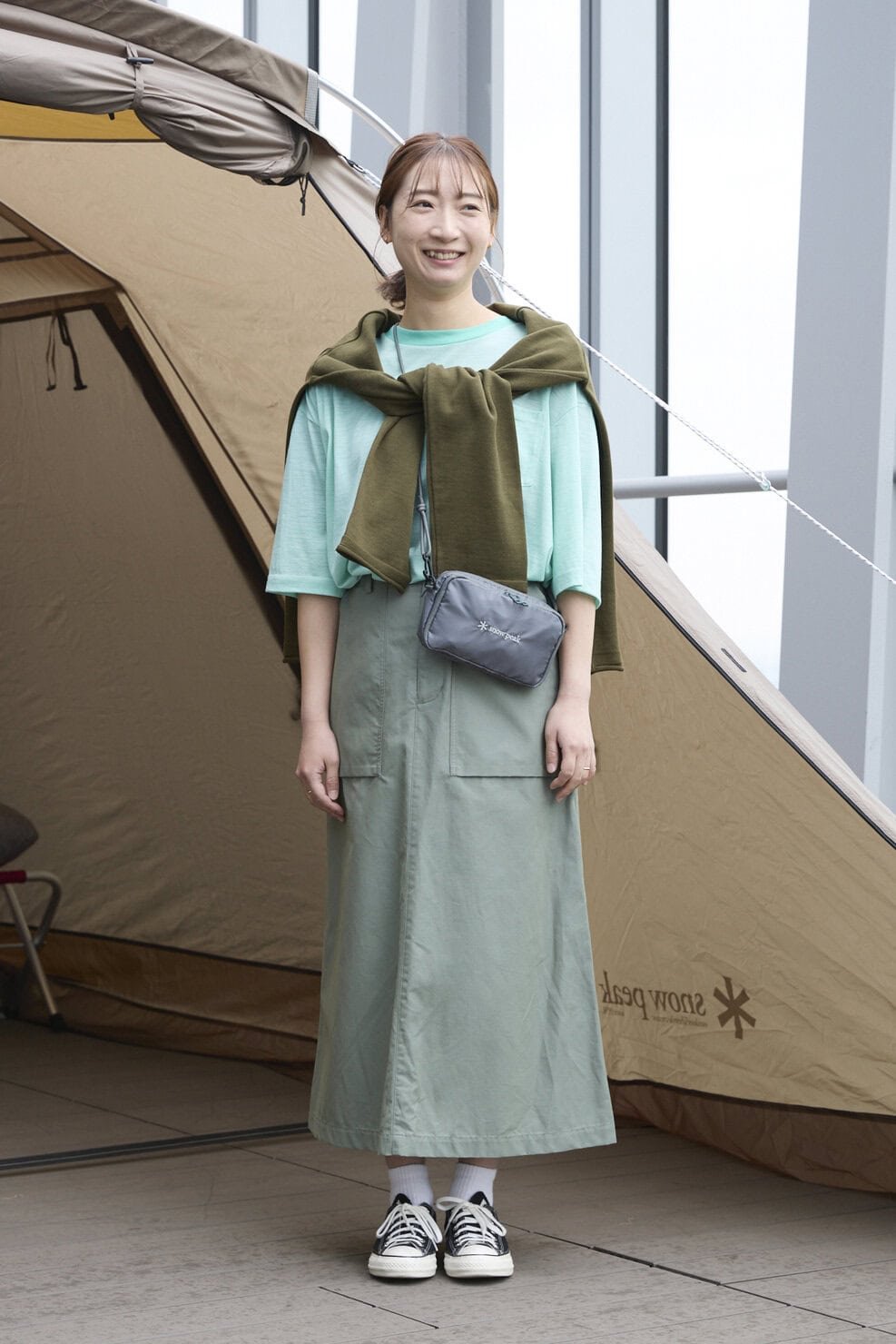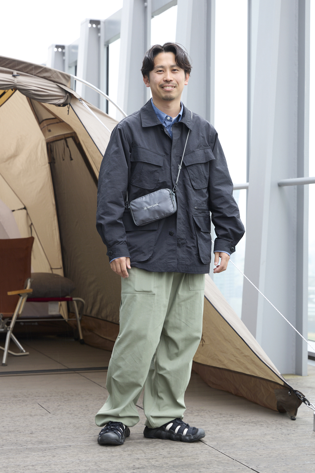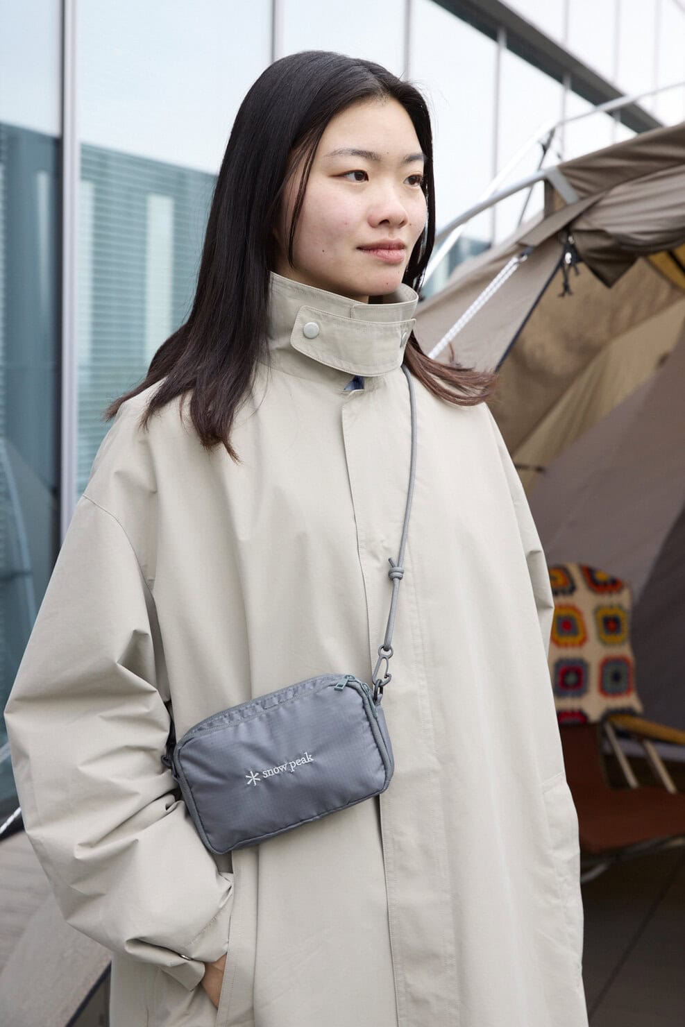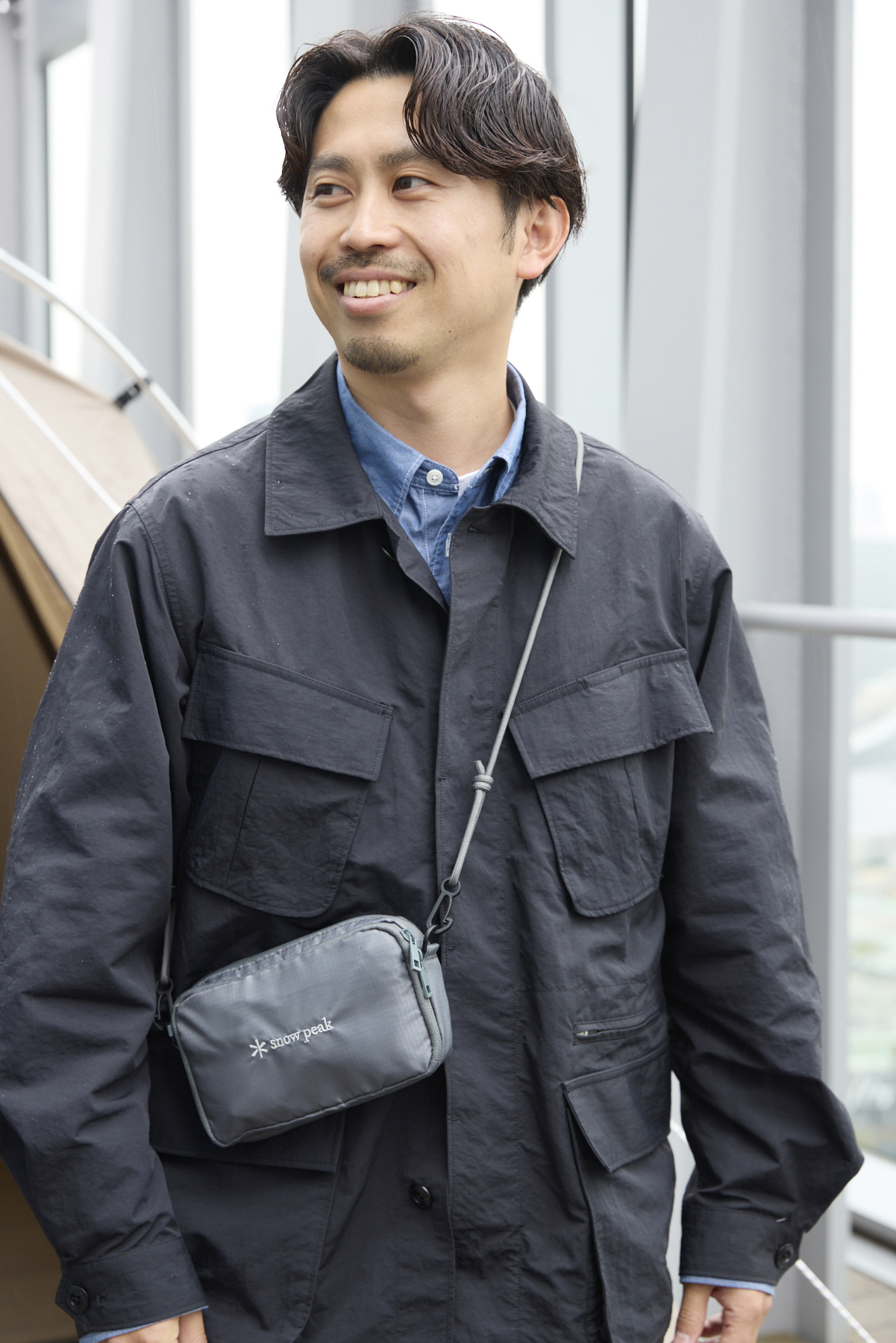 リップストップ素材で軽量設計のお財布ショルダーを、スノーピークのスタッフ3名が普段の着こなしと合わせてくれました。