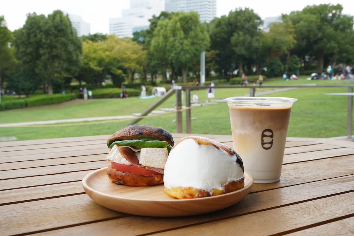 右)テラス席で、ゆったりとした時間を過ごせます。左から時計回りに、ナポリサンド、マンハッタン、生ナポリドーナツ、焼きカボチャマロン&アールグレイキャラメル
