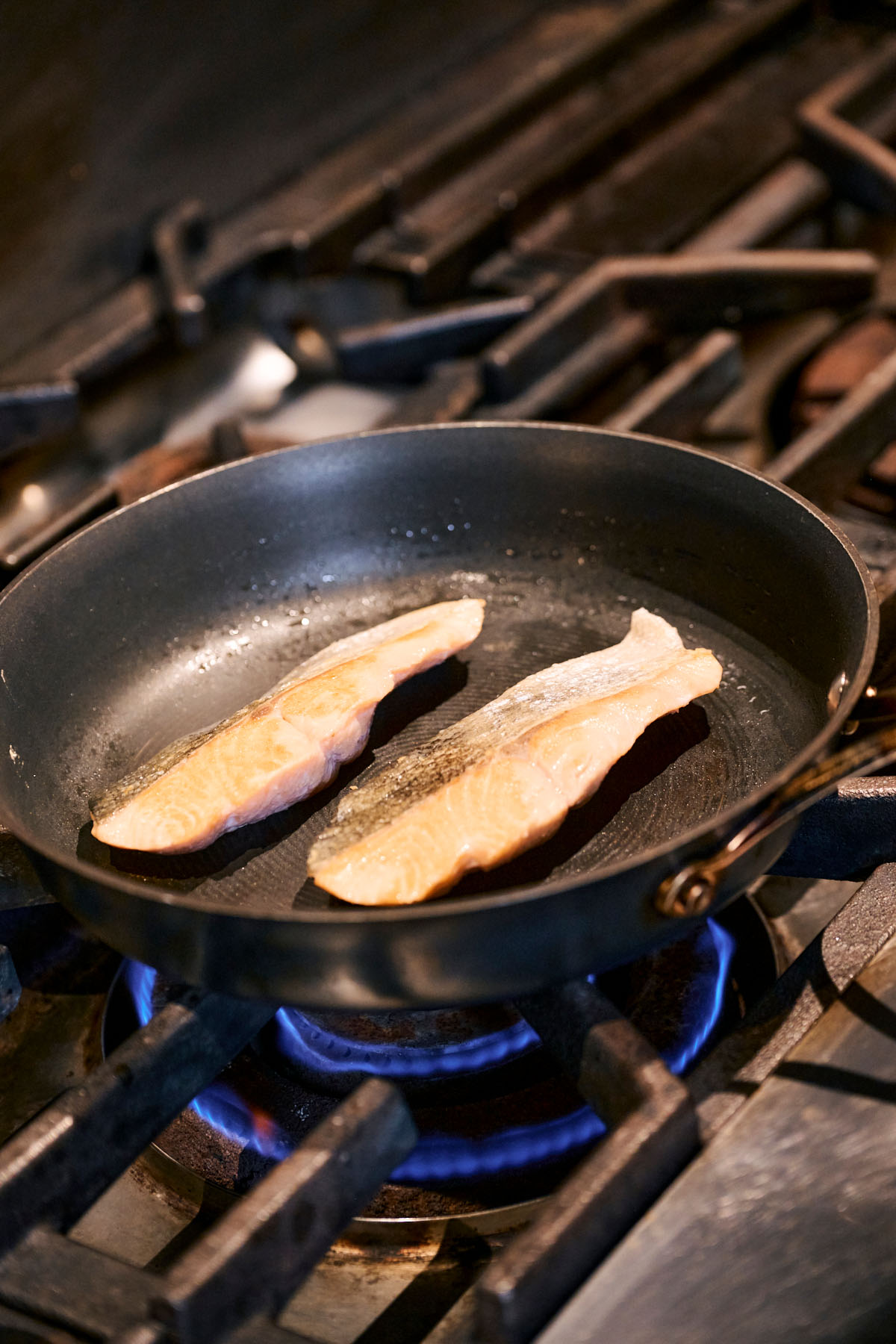 焼くときはフライパンが冷たい状態のまま魚を入れ、それから火をつけると失敗がありません。皮目を下にし、フライ返しで軽く押さえながらしっかり焼き色をつけるのがポイントです。身に火を入れすぎると固くなるので、“皮面が7割、身が3割”くらいのイメージで焼くとおいしくジューシーな仕上がりに。
